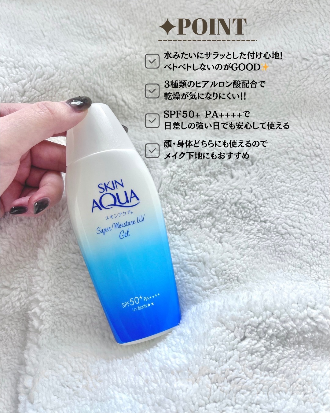 屋外活動の日にコレ1本♪大容量165gの日焼け止めを見つけてしまった‼️スキンアクアスーパーモイスチャーUVジェルSPF50+PA++++心強いスーパーウォータープルーフ✨顔・体にも使えて化粧下地にも◎光耐久カプセルNEO*が採用されているか...