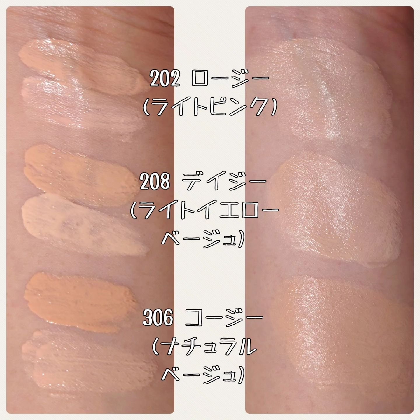 - <202 ロージー> 水,シクロペンタシロキサン,酸化チタン,メトキシケイヒ酸エチルヘキシル,DPG,メチルトリメチコン,酸化亜鉛,ポリメタクリル酸メチル,BG,ラウリルPEG-8ジメチコン,フェニルベンズイミダゾールスルホン酸,ナイアシンアミド,ナイロン-12,トロメタミン,セチルPEG/PPG-10/1ジメチコン,塩化Na,セスキオレイン酸ソルビタン,プロパンジオール,スベリヒユエキス,ジシロキサン,パンテノール,CI 77492,ジステアルジモニウムヘクトライト,安息香酸Na,カプリリルグリコール,(ジメチコン/メチコン)コポリマー,ラウロイルリシン,合成ミツロウ,酢酸トコフェロール,トリエトキシカプリリルシラン,CI 77491,水酸化Al,(トリメチルシロキシケイ酸/ジメチコノール)クロスポリマー,(ジメチコン/ビニルジメチコン)クロスポリマー,ソルビン酸K,ラベンダー油,エチルヘキシルグリセリン,バチルス発酵物,ヒマワリ種子油,アデノシン,CI 77499,エチレンジアミンジコハク酸3Na,ツバキ花エキス,1,2-ヘキサンジオール,ヒアルロン酸Na,加水分解ヒアルロン酸,ヒアルロン酸,シロバナルーピン種子エキス,グリセリン,トリメチルシロキシケイ酸,イチゴ葉エキス,クサスギカズラ根エキス,アウレオバシジウムプルランス培養物,レピジウムメイエニ根エキス,トコフェロール,加水分解コラーゲン,ヒアルロン酸ヒドロキシプロピルトリモニウム,水溶性コラーゲン,アセチルヒアルロン酸Na,加水分解ヒアルロン酸Na,ヒアルロン酸クロスポリマーNa,ヒアルロン酸K,アテロコラーゲン <208 デイジー> 水,シクロペンタシロキサン,酸化チタン,メトキシケイヒ酸エチルヘキシル,DPG,メチルトリメチコン,酸化亜鉛,ポリメタクリル酸メチル,BG,ラウリルPEG-8ジメチコン,フェニルベンズイミダゾールスルホン酸,ナイアシンアミド,ナイロン-12,トロメタミン,セチルPEG/PPG-10/1ジメチコン,塩化Na,セスキオレイン酸ソルビタン,プロパンジオール,スベリヒユエキス,CI 77492,ジシロキサン,パンテノール,ジステアルジモニウムヘクトライト,安息香酸Na,カプリリルグリコール,(ジメチコン/メチコン)コポリマー,ラウロイルリシン,合成ミツロウ,酢酸トコフェロール,トリエトキシカプリリルシラン,水酸化Al,CI 77491,(トリメチルシロキシケイ酸/ジメチコノール)クロスポリマー,(ジメチコン/ビニルジメチコン)クロスポリマー,ソルビン酸K,ラベンダー油,エチルヘキシルグリセリン,バチルス発酵物,ヒマワリ種子油,アデノシン,CI 77499,エチレンジアミンジコハク酸3Na,ツバキ花エキス,1,2-ヘキサンジオール,ヒアルロン酸Na,加水分解ヒアルロン酸,ヒアルロン酸,シロバナルーピン種子エキス,グリセリン,トリメチルシロキシケイ酸,イチゴ葉エキス,クサスギカズラ根エキス,アウレオバシジウムプルランス培養物,レピジウムメイエニ根エキス,トコフェロール,加水分解コラーゲン,ヒアルロン酸ヒドロキシプロピルトリモニウム,水溶性コラーゲン,アセチルヒアルロン酸Na,加水分解ヒアルロン酸Na,ヒアルロン酸クロスポリマーNa,ヒアルロン酸K,アテロコラーゲン <306 コージー> 水,シクロペンタシロキサン,酸化チタン,メトキシケイヒ酸エチルヘキシル,DPG,メチルトリメチコン,酸化亜鉛,ポリメタクリル酸メチル,BG,ラウリルPEG-8ジメチコン,フェニルベンズイミダゾールスルホン酸,ナイアシンアミド,ナイロン-12,トロメタミン,セチルPEG/PPG-10/1ジメチコン,塩化Na,セスキオレイン酸ソルビタン,プロパンジオール,CI 77492,スベリヒユエキス,パンテノール,ジシロキサン,ジステアルジモニウムヘクトライト,ラウロイルリシン,安息香酸Na,(ジメチコン/メチコン)コポリマー,合成ミツロウ,酢酸トコフェロール,CI 77491,水酸化Al,(トリメチルシロキシケイ酸/ジメチコノール)クロスポリマー,トリエトキシカプリリルシラン,(ジメチコン/ビニルジメチコン)クロスポリマー,ソルビン酸K,ラベンダー油,バチルス発酵物,ヒマワリ種子油,ポリヒドロキシステアリン酸,CI 77499,EDTA-2Na,アデノシン,パルミチン酸エチルヘキシル,ミリスチン酸イソプロピル,イソステアリン酸,レシチン,ツバキ花エキス,ポリリシノレイン酸ポリグリセリル-3,1,2-ヘキサンジオール,ヒアルロン酸Na,加水分解ヒアルロン酸,ヒアルロン酸,シロバナルーピン種子エキス,グリセリン,トリメチルシロキシケイ酸,イチゴ葉エキス,クサスギカズラ根エキス,アウレオバシジウムプルランス培養物,レピジウムメイエニ根エキス,加水分解コラーゲン,ヒアルロン酸ヒドロキシプロピルトリモニウム,水溶性コラーゲン,トコフェロール,アセチルヒアルロン酸Na,加水分解ヒアルロン酸Na,ヒアルロン酸クロスポリマーNa,ヒアルロン酸K,アテロコラーゲン