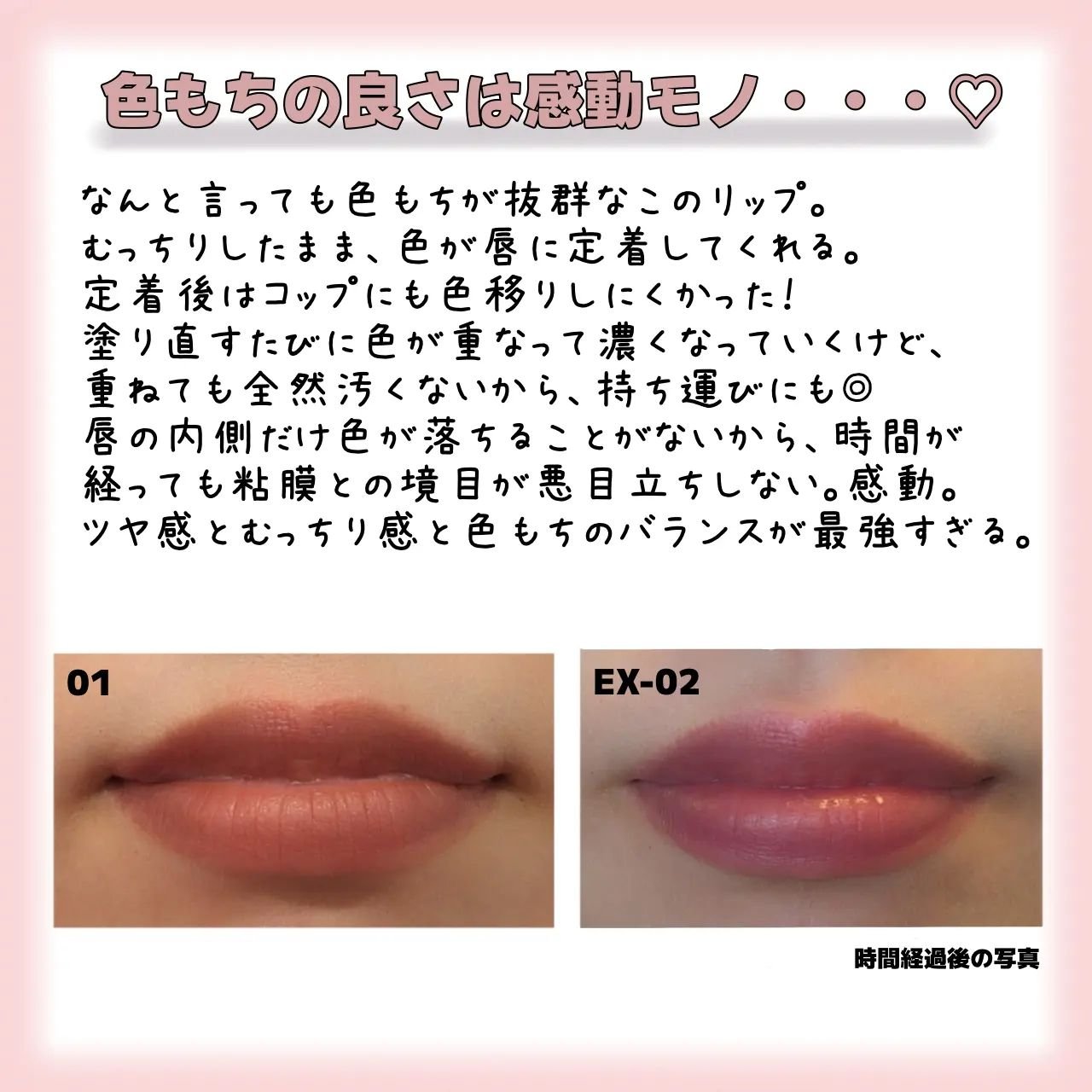 まず、全部色がかわいいよね。 絶妙なくすみカラーで、肌なじみ抜群。 01は1番シャレてる色だと思ってる。 落ち着きながらも個性を出したいときにオススメ❢ EX-02は大人ローズで、ライラックカラーがお上品。 このツヤ感と保湿力で、こんなに色持つの最高すぎない? 色持ちが良いリップって、唇の内側だけ剥がれて、 粘膜との境目が目立っちゃうのが嫌なんだけど、 このリップはそれがないから本当に感動した。 お値段もデパコスにしては、 手の届きやすい価格でありがたい。 レフィルだけでも十分使えるから 皆さんも是非お試ししてほしい逸品。