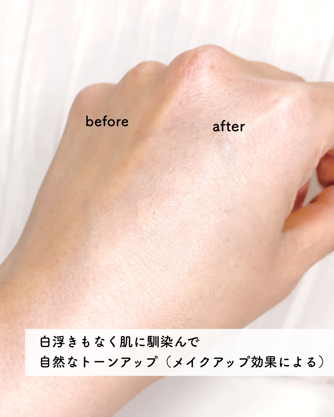 滑らかなテクスチャーでツヤメイクを長時間キープして上品な陶器肌を演出。 SPF50+、PA++++とUV効果もしっかりあるのにベタつかず素肌のようなトーンアップ*できるよ。