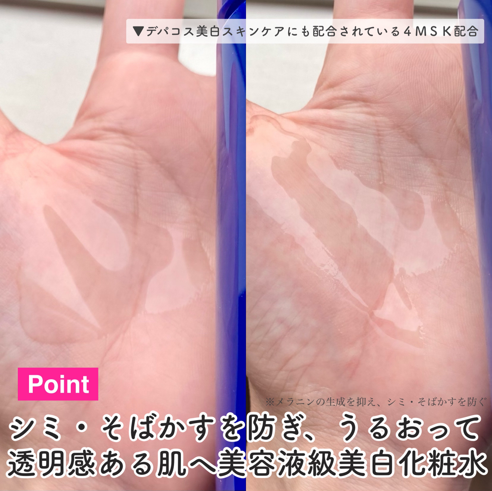 - 【医薬部外品】 <究極の成分コラボ>4MSK*1+CICA*2配合の本気の成分アプローチ 美容液級 美白化粧水 デパコスにも配合の美白*3有効成分4MSK*1がシミのもとに直行。シミ・そばかすを防ぎ、うるおって明るく透明感のある肌へ。 肌を保護するCICA*2、浸透美容アミノ酸*4、Wヒアルロン酸*5、コラーゲンGL*6など、美肌に導く成分を贅沢に配合。 資生堂サロン&スパ エステティシャン監修の、美容液のような心地よい繊細なとろみ液が、キメの奥までじゅわ~っと浸透*7。 優しく香るローズアクアの香りが、快適度を高めます。 「しっとり」と「とてもしっとり」の2タイプがあり、お好みの使用感でお選びいただけます。 *1 メラニンの生成を抑え、シミ・そばかすを防ぐ *2 4-メトキシサリチル酸カリウム塩 *3 (肌保護)ツボクサエキス *4 (うるおい保持成分)D-グルタミン酸、DL-アラニン、DL-メチオニン *5 (保湿成分)アセチル化ヒアルロン酸Na、ヒアルロン酸Na *6 (保湿成分)水溶性コラーゲン、グリセリン *7 角層まで