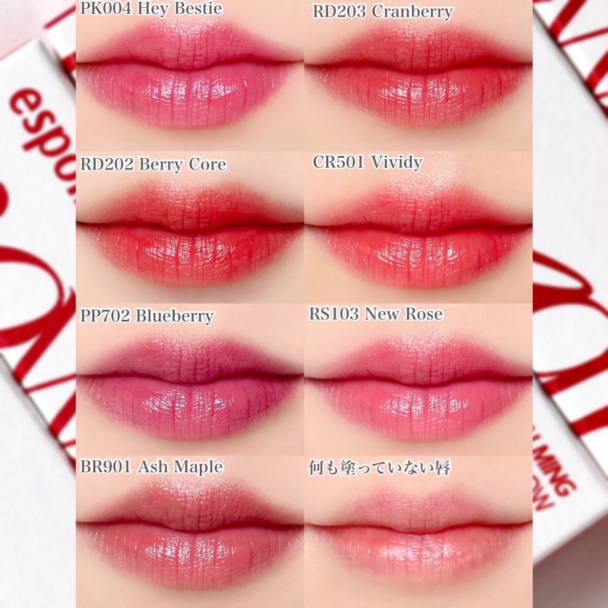 - <01 ヴィヴィディ(Vividy)【EC展開カラー】> ペンタイソステアリン酸ジペンタエリスリチル、トリ(カプリル酸/カプリン酸)グリセリル、ラウロイルグルタミン酸ジ(フィトステリル/オクチルドデシル)、オクチルドデカノール、グリセリルウンデシルジメチコン、ジフェニルジメチコン、合成ワックス、ダイマージリノール酸(フィトステリル/イソステアリル/セチル/ステアリル/ベヘニル)、トリイソステアリン酸ポリグリセリル-2、(アクリレーツ/アクリル酸ステアリル/メタクリル酸ジメチコン)コポリマー、ラウリルポリグリセリル-3ポリジメチルシロキシエチルジメチコン、(エチレン/プロピレン)コポリマー、ジメチコン、ポリヒドロキシステアリン酸、香料、レシチン、パルミチン酸エチルヘキシル、イソステアリン酸、ミリスチン酸イソプロピル、ポリリシノレイン酸ポリグリセリル-3、水酸化Al、トリエトキシカプリリルシラン、トコフェロール、赤226、黄5、赤104(1)、酸化チタン、赤201 <02 ベリーコア(Berry Core)> ペンタイソステアリン酸ジペンタエリスリチル、トリ(カプリル酸/カプリン酸)グリセリル、オクチルドデカノール、ラウロイルグルタミン酸ジ(フィトステリル/オクチルドデシル)、グリセリルウンデシルジメチコン、ジフェニルジメチコン、合成ワックス、ダイマージリノール酸(フィトステリル/イソステアリル/セチル/ステアリル/ベヘニル)、トリイソステアリン酸ポリグリセリル-2、(アクリレーツ/アクリル酸ステアリル/メタクリル酸ジメチコン)コポリマー、ラウリルポリグリセリル-3ポリジメチルシロキシエチルジメチコン、(エチレン/プロピレン)コポリマー、ジメチコン、香料、トコフェロール、赤202、赤201、黄5、酸化鉄 <03 クランベリー(Cranberry)【EC展開カラー】> ペンタイソステアリン酸ジペンタエリスリチル、オクチルドデカノール、トリ(カプリル酸/カプリン酸)グリセリル、ラウロイルグルタミン酸ジ(フィトステリル/オクチルドデシル)、グリセリルウンデシルジメチコン、ジフェニルジメチコン、合成ワックス、ダイマージリノール酸(フィトステリル/イソステアリル/セチル/ステアリル/ベヘニル)、トリイソステアリン酸ポリグリセリル-2、(アクリレーツ/アクリル酸ステアリル/メタクリル酸ジメチコン)コポリマー、ラウリルポリグリセリル-3ポリジメチルシロキシエチルジメチコン、(エチレン/プロピレン)コポリマー、ジメチコン、香料、リンゴ酸ジイソステアリル、トコフェロール、ポリヒドロキシステアリン酸、レシチン、トリエトキシカプリリルシラン、パルミチン酸エチルヘキシル、イソステアリン酸、ミリスチン酸イソプロピル、ポリリシノレイン酸ポリグリセリル-3、酸化鉄、黄5、赤202、赤230(1) <04 ヘイベスティ(Hey Bestie)【EC展開カラー】> ペンタイソステアリン酸ジペンタエリスリチル、トリ(カプリル酸/カプリン酸)グリセリル、ラウロイルグルタミン酸ジ(フィトステリル/オクチルドデシル)、オクチルドデカノール、ジフェニルジメチコン、グリセリルウンデシルジメチコン、合成ワックス、ダイマージリノール酸(フィトステリル/イソステアリル/セチル/ステアリル/ベヘニル)、トリイソステアリン酸ポリグリセリル-2、ラウリルポリグリセリル-3ポリジメチルシロキシエチルジメチコン、(アクリレーツ/アクリル酸ステアリル/メタクリル酸ジメチコン)コポリマー、ポリヒドロキシステアリン酸、(エチレン/プロピレン)コポリマー、ジメチコン、レシチン、香料、パルミチン酸エチルヘキシル、イソステアリン酸、ミリスチン酸イソプロピル、ポリリシノレイン酸ポリグリセリル-3、水酸化Al、トリエトキシカプリリルシラン、トコフェロール、酸化チタン、赤202、黄5、赤104(1)、酸化鉄、青1 <05 ブルーベリー(Blueberry)> ペンタイソステアリン酸ジペンタエリスリチル、トリ(カプリル酸/カプリン酸)グリセリル、ラウロイルグルタミン酸ジ(フィトステリル/オクチルドデシル)、オクチルドデカノール、グリセリルウンデシルジメチコン、ジフェニルジメチコン、合成ワックス、ダイマージリノール酸(フィトステリル/イソステアリル/セチル/ステアリル/ベヘニル)、トリイソステアリン酸ポリグリセリル-2、ラウリルポリグリセリル-3ポリジメチルシロキシエチルジメチコン、(アクリレーツ/アクリル酸ステアリル/メタクリル酸ジメチコン)コポリマー、(エチレン/プロピレン)コポリマー、ジメチコン、香料、水酸化Al、トリエトキシカプリリルシラン、トコフェロール、酸化チタン、酸化鉄、赤202、青1、赤104(1) <06 ニューローズ(New Rose)> ペンタイソステアリン酸ジペンタエリスリチル、トリ(カプリル酸/カプリン酸)グリセリル、ラウロイルグルタミン酸ジ(フィトステリル/オクチルドデシル)、オクチルドデカノール、ジフェニルジメチコン、グリセリルウンデシルジメチコン、合成ワックス、ダイマージリノール酸(フィトステリル/イソステアリル/セチル/ステアリル/ベヘニル)、トリイソステアリン酸ポリグリ
