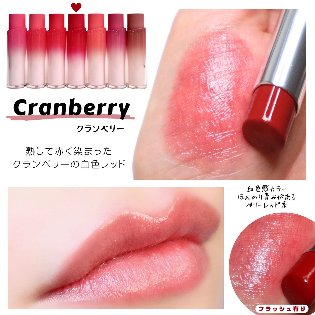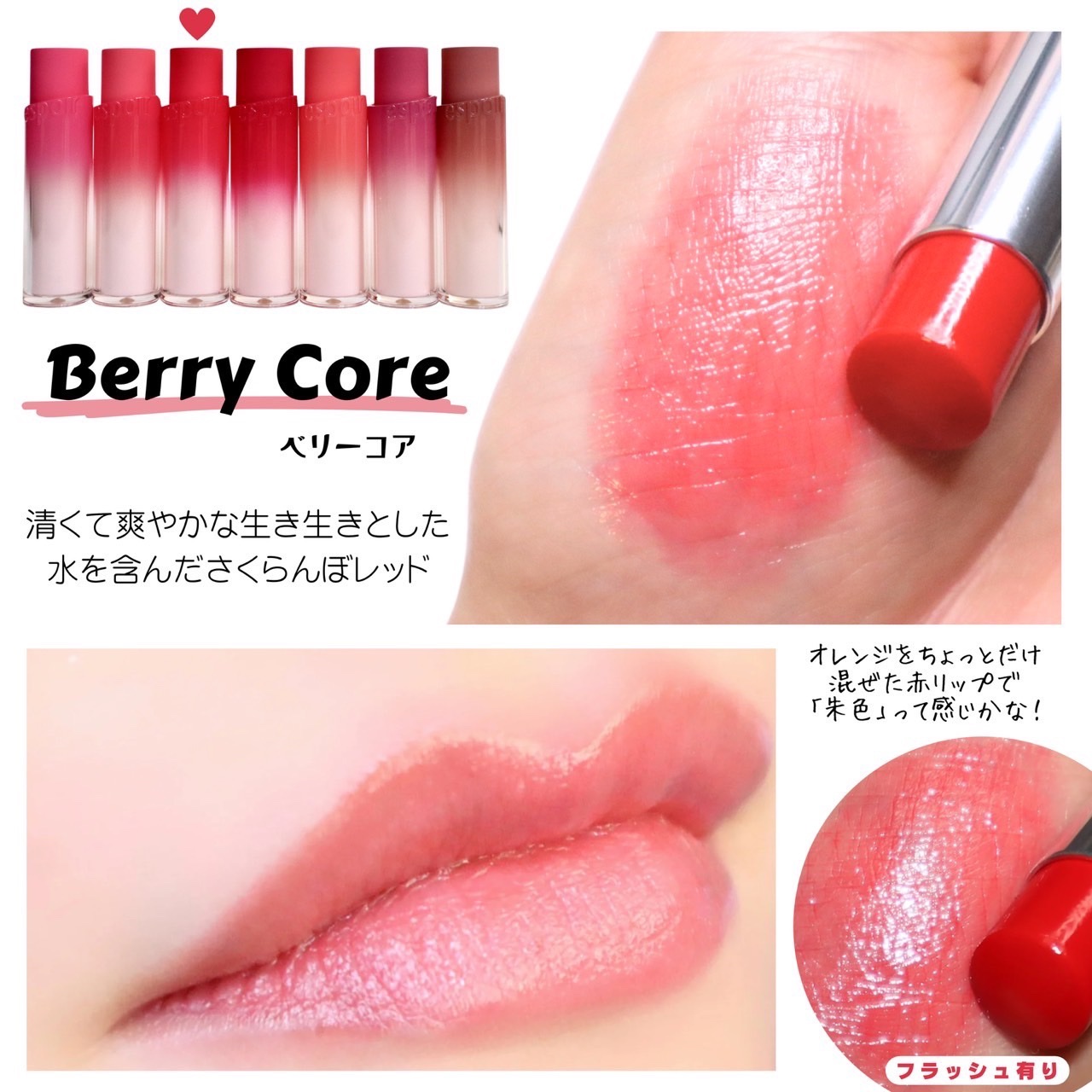 - <01 ヴィヴィディ(Vividy)【EC展開カラー】> ペンタイソステアリン酸ジペンタエリスリチル、トリ(カプリル酸/カプリン酸)グリセリル、ラウロイルグルタミン酸ジ(フィトステリル/オクチルドデシル)、オクチルドデカノール、グリセリルウンデシルジメチコン、ジフェニルジメチコン、合成ワックス、ダイマージリノール酸(フィトステリル/イソステアリル/セチル/ステアリル/ベヘニル)、トリイソステアリン酸ポリグリセリル-2、(アクリレーツ/アクリル酸ステアリル/メタクリル酸ジメチコン)コポリマー、ラウリルポリグリセリル-3ポリジメチルシロキシエチルジメチコン、(エチレン/プロピレン)コポリマー、ジメチコン、ポリヒドロキシステアリン酸、香料、レシチン、パルミチン酸エチルヘキシル、イソステアリン酸、ミリスチン酸イソプロピル、ポリリシノレイン酸ポリグリセリル-3、水酸化Al、トリエトキシカプリリルシラン、トコフェロール、赤226、黄5、赤104(1)、酸化チタン、赤201 <02 ベリーコア(Berry Core)> ペンタイソステアリン酸ジペンタエリスリチル、トリ(カプリル酸/カプリン酸)グリセリル、オクチルドデカノール、ラウロイルグルタミン酸ジ(フィトステリル/オクチルドデシル)、グリセリルウンデシルジメチコン、ジフェニルジメチコン、合成ワックス、ダイマージリノール酸(フィトステリル/イソステアリル/セチル/ステアリル/ベヘニル)、トリイソステアリン酸ポリグリセリル-2、(アクリレーツ/アクリル酸ステアリル/メタクリル酸ジメチコン)コポリマー、ラウリルポリグリセリル-3ポリジメチルシロキシエチルジメチコン、(エチレン/プロピレン)コポリマー、ジメチコン、香料、トコフェロール、赤202、赤201、黄5、酸化鉄 <03 クランベリー(Cranberry)【EC展開カラー】> ペンタイソステアリン酸ジペンタエリスリチル、オクチルドデカノール、トリ(カプリル酸/カプリン酸)グリセリル、ラウロイルグルタミン酸ジ(フィトステリル/オクチルドデシル)、グリセリルウンデシルジメチコン、ジフェニルジメチコン、合成ワックス、ダイマージリノール酸(フィトステリル/イソステアリル/セチル/ステアリル/ベヘニル)、トリイソステアリン酸ポリグリセリル-2、(アクリレーツ/アクリル酸ステアリル/メタクリル酸ジメチコン)コポリマー、ラウリルポリグリセリル-3ポリジメチルシロキシエチルジメチコン、(エチレン/プロピレン)コポリマー、ジメチコン、香料、リンゴ酸ジイソステアリル、トコフェロール、ポリヒドロキシステアリン酸、レシチン、トリエトキシカプリリルシラン、パルミチン酸エチルヘキシル、イソステアリン酸、ミリスチン酸イソプロピル、ポリリシノレイン酸ポリグリセリル-3、酸化鉄、黄5、赤202、赤230(1) <04 ヘイベスティ(Hey Bestie)【EC展開カラー】> ペンタイソステアリン酸ジペンタエリスリチル、トリ(カプリル酸/カプリン酸)グリセリル、ラウロイルグルタミン酸ジ(フィトステリル/オクチルドデシル)、オクチルドデカノール、ジフェニルジメチコン、グリセリルウンデシルジメチコン、合成ワックス、ダイマージリノール酸(フィトステリル/イソステアリル/セチル/ステアリル/ベヘニル)、トリイソステアリン酸ポリグリセリル-2、ラウリルポリグリセリル-3ポリジメチルシロキシエチルジメチコン、(アクリレーツ/アクリル酸ステアリル/メタクリル酸ジメチコン)コポリマー、ポリヒドロキシステアリン酸、(エチレン/プロピレン)コポリマー、ジメチコン、レシチン、香料、パルミチン酸エチルヘキシル、イソステアリン酸、ミリスチン酸イソプロピル、ポリリシノレイン酸ポリグリセリル-3、水酸化Al、トリエトキシカプリリルシラン、トコフェロール、酸化チタン、赤202、黄5、赤104(1)、酸化鉄、青1 <05 ブルーベリー(Blueberry)> ペンタイソステアリン酸ジペンタエリスリチル、トリ(カプリル酸/カプリン酸)グリセリル、ラウロイルグルタミン酸ジ(フィトステリル/オクチルドデシル)、オクチルドデカノール、グリセリルウンデシルジメチコン、ジフェニルジメチコン、合成ワックス、ダイマージリノール酸(フィトステリル/イソステアリル/セチル/ステアリル/ベヘニル)、トリイソステアリン酸ポリグリセリル-2、ラウリルポリグリセリル-3ポリジメチルシロキシエチルジメチコン、(アクリレーツ/アクリル酸ステアリル/メタクリル酸ジメチコン)コポリマー、(エチレン/プロピレン)コポリマー、ジメチコン、香料、水酸化Al、トリエトキシカプリリルシラン、トコフェロール、酸化チタン、酸化鉄、赤202、青1、赤104(1) <06 ニューローズ(New Rose)> ペンタイソステアリン酸ジペンタエリスリチル、トリ(カプリル酸/カプリン酸)グリセリル、ラウロイルグルタミン酸ジ(フィトステリル/オクチルドデシル)、オクチルドデカノール、ジフェニルジメチコン、グリセリルウンデシルジメチコン、合成ワックス、ダイマージリノール酸(フィトステリル/イソステアリル/セチル/ステアリル/ベヘニル)、トリイソステアリン酸ポリグリ