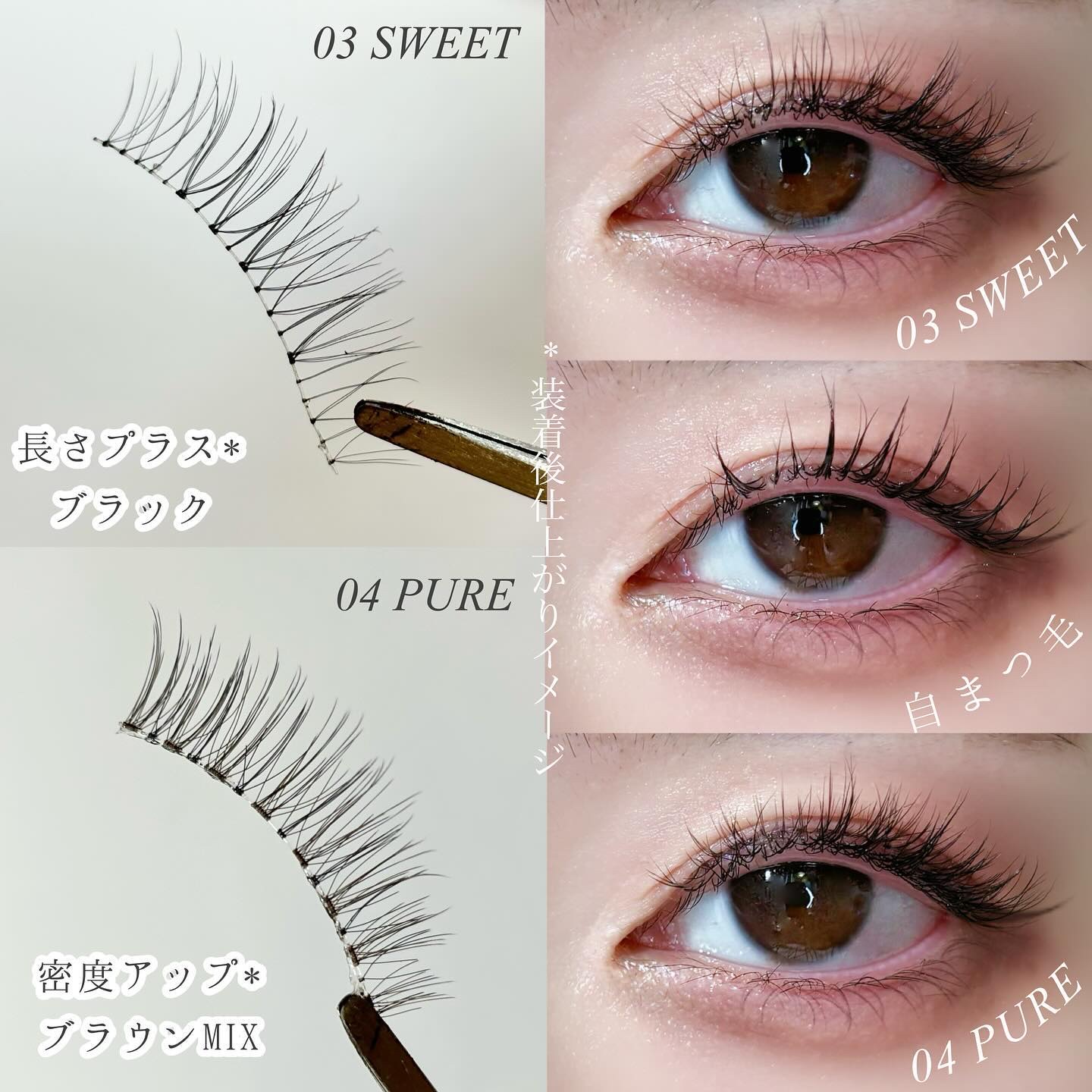 - “ワンタッチ”で理想のまつげが叶うつけまつげです。 最初から束になっているからそのままつけるだけで簡単に”束感まつげ”が完成する01・02、抜け感のあるデザインでサロンで施術した”まつげエクステ”のような仕上がりになる03~06の全6種。 自まつげが少なくても、短くても、生えグセがあっても、誰でもキレイなまつげに。ナチュラルな繊細毛で、自然かつ華やかな目元を演出します。