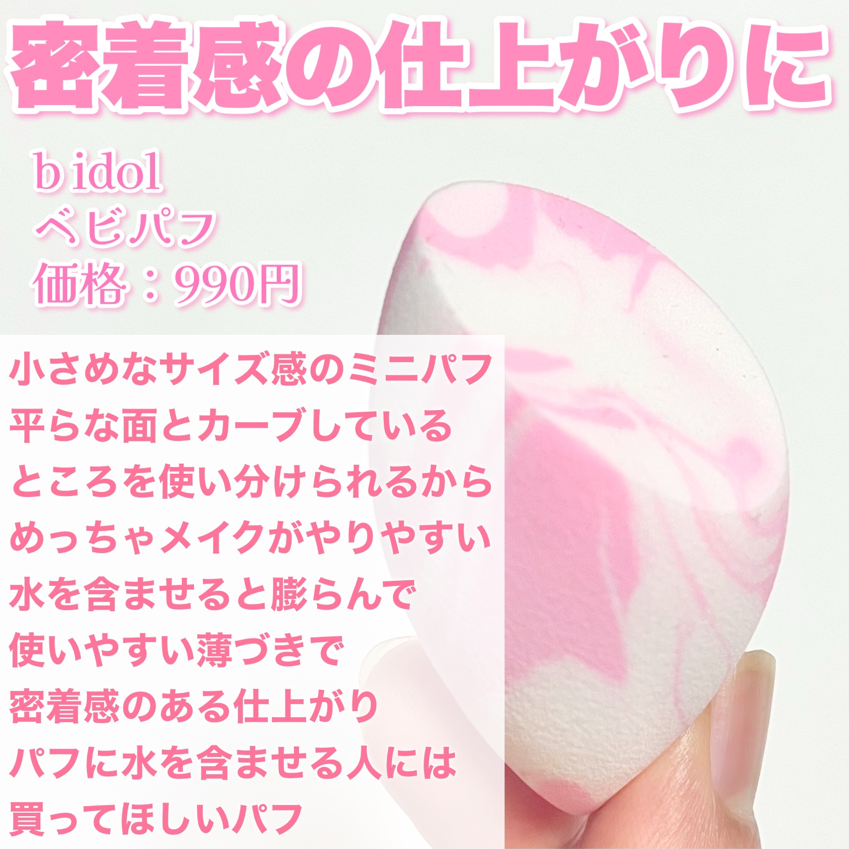 優しい♡肌あたりがソフトbidol ベビパフ ¥990軽い肌あたりで、ファンデーションを優しく肌に乗せられる感じ乾いたままだとスポンジに染み込みやすい水を含ませたらスポンジが吸収するのは少ないように感じました😊動画であかりんが使っていたように...