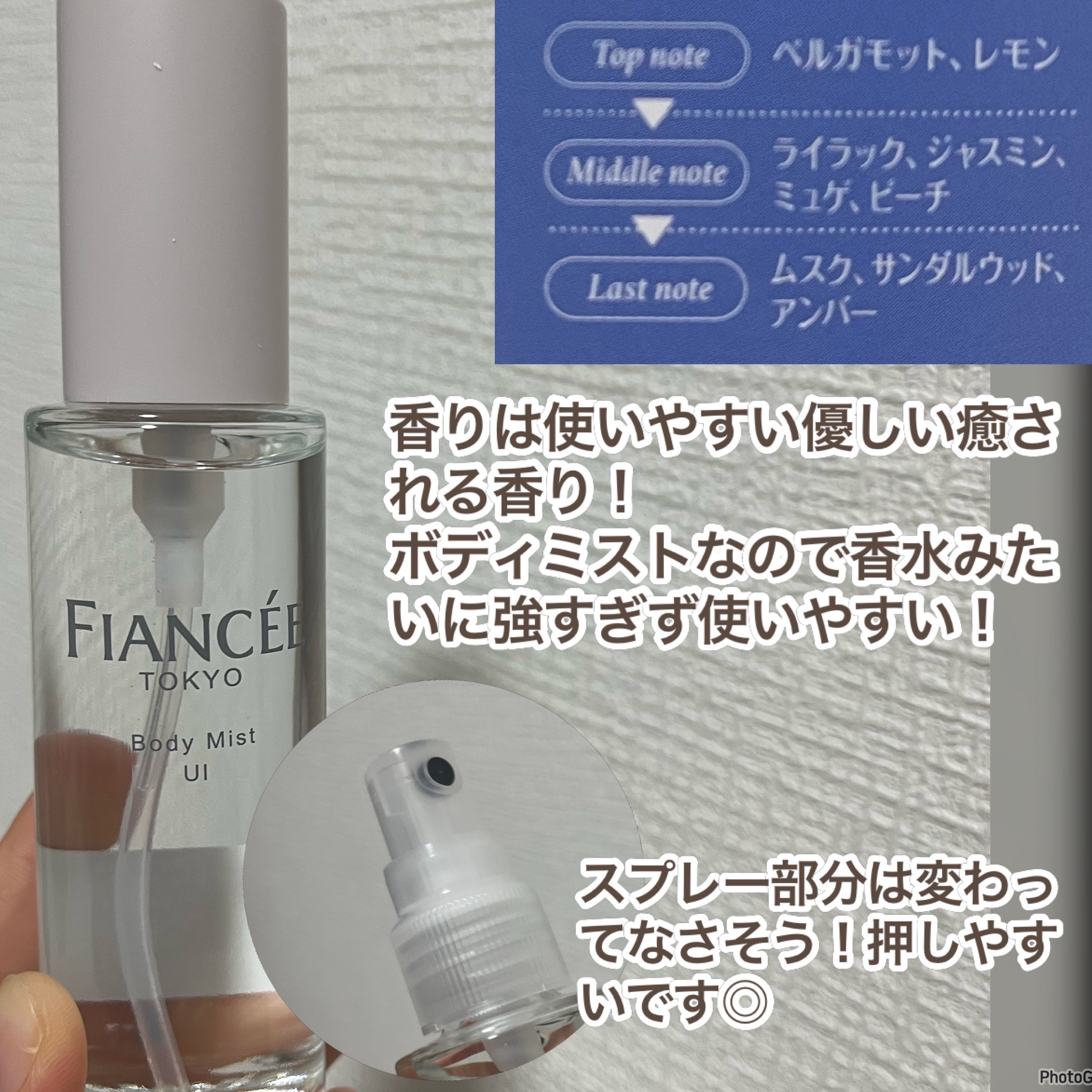 フィアンセボディミストUI¥1,320✂ライラックの花言葉「初恋」からインスパイアされた、柔らかで透明感溢れる香り!初恋の清らかさを花々で繊細な心をムスクで表現しているらしいです!香りの変化は柑橘系の爽やかな香りからライラックの花々の香りへそ...