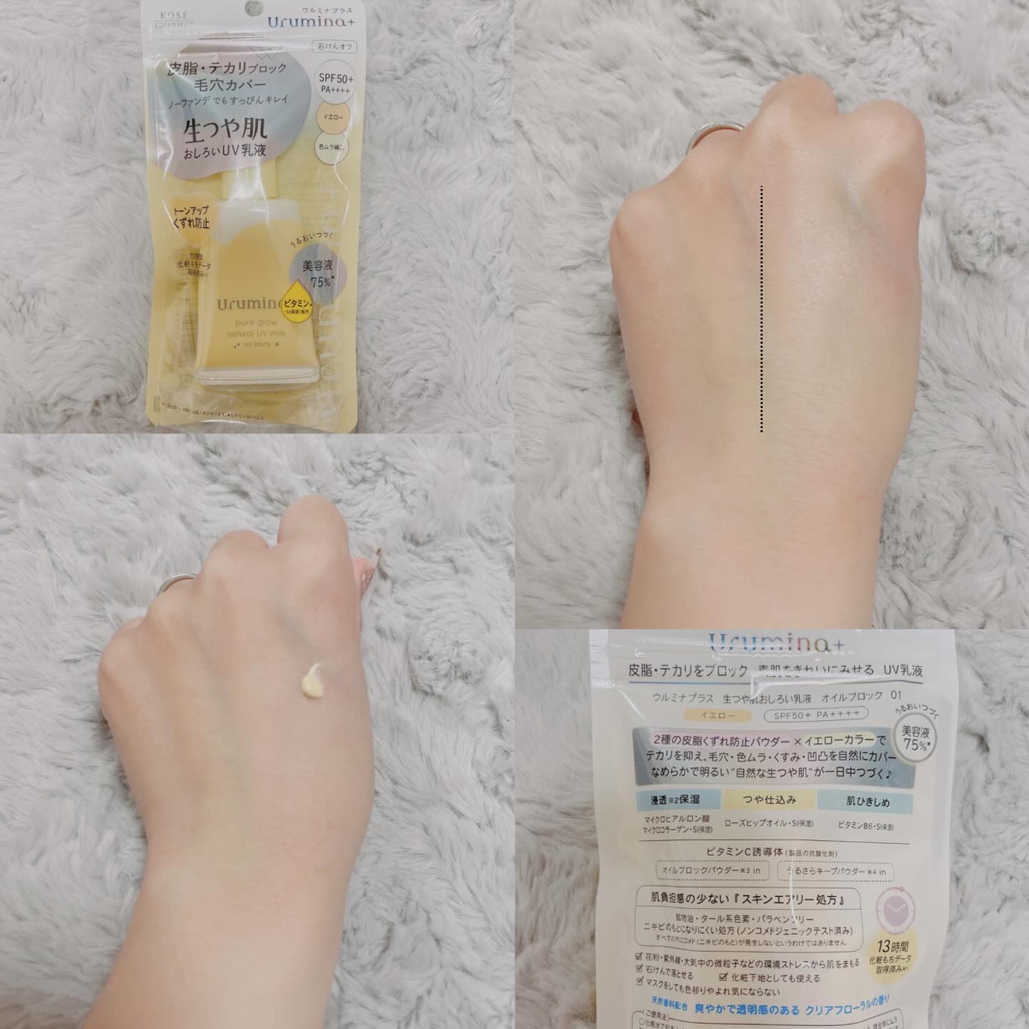 オイルブロックパウダー&うるさらキープパウダー配合で、皮脂・テカリをブロックしながら毛穴をカバーしてメイクしたてのうるさら肌を1日中キープする、みずみずしいスキンケアタッチのおしろい乳液。 トーンアップ&色ムラ補正効果のあるイエローカラー。爽やかなクリアフローラルの香り。 ツヤ感は程々に出て良いのですが、塗った方が汚くなる物は使えないのでボディ行きです🥲