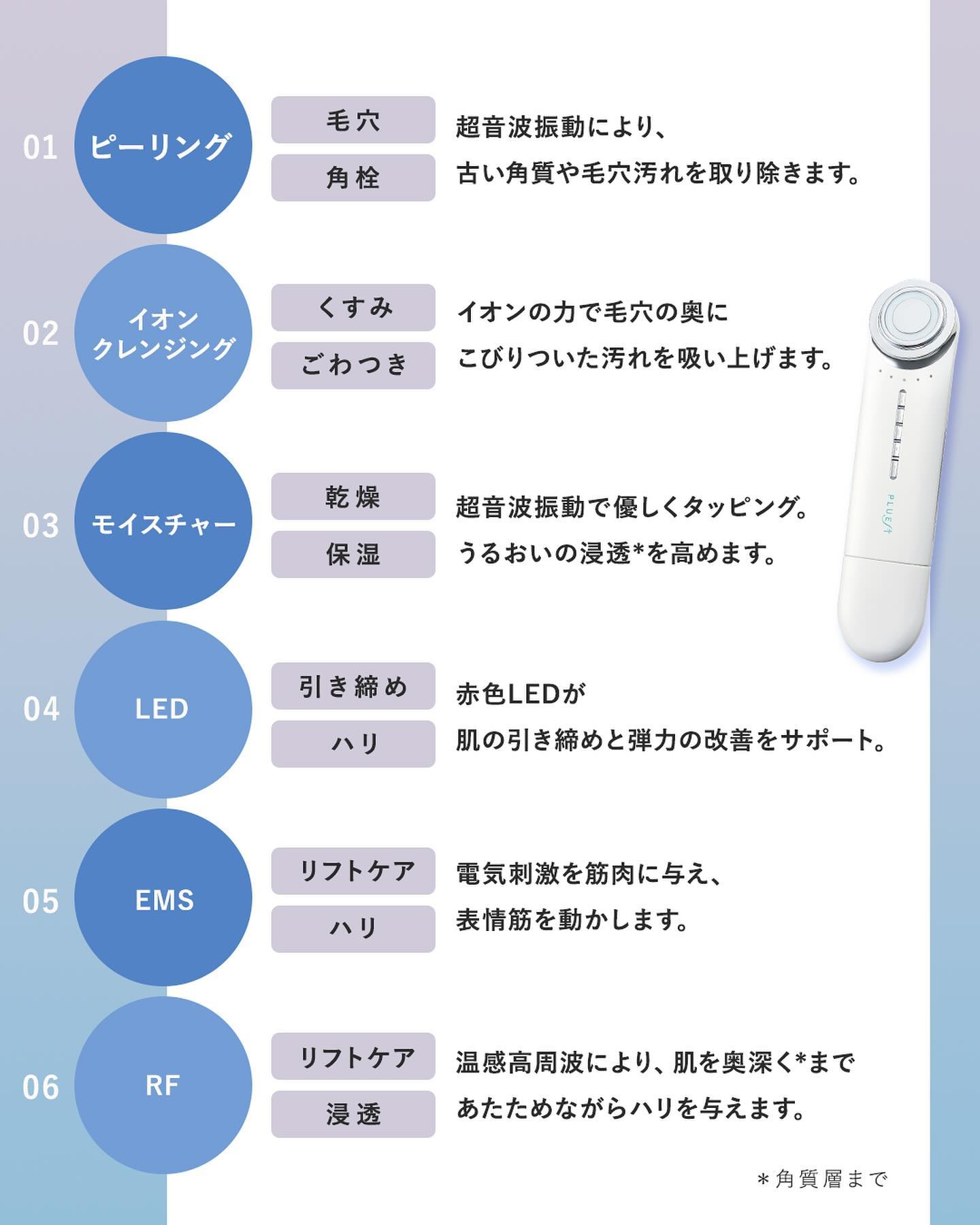 - あらゆる悩みもまとめて吹き飛ばす ワンランク上の若見え素肌へ 落とすケアから表情筋ケアまで6つのモードを搭載した多機能美顔器。 いつものスキンケアにプラスすることでより深く※までアプローチ。 モードを組み合わせることで手早く効果を高めることができます。 ※角質層まで ●落とすケアから引き上げケアまで選べる6つのモード 01. ピーリング 超音波振動により、古い角質や毛穴汚れを取り除きます。 推奨頻度:週に2~3回、1日1回まで 02. イオンクレンジング イオンの力で毛穴の奥にこびりついた汚れを吸い上げます。 推奨頻度:週に2~3回、1日1回まで ※ピーリングケアと日を分けてご使用いただくことをおすすめします。 03. モイスチャー 超音波振動で優しくタッピング。うるおいの浸透*を高めます。 推奨頻度:1日1回 04. LED 赤色LEDが肌の引き締めと弾力の改善をサポート。 推奨頻度:1日1回 05. EMS 電気刺激を筋肉に与え、表情筋を動かします。 推奨頻度:週に1~2回、1日1回まで ※LEDとの併用が可能 06. RF 温感高周波により、肌を奥深く*まであたためながらハリを与えます。 推奨頻度:週に2~3回、1日1回まで ※LEDとの併用が可能 * 角質層まで
