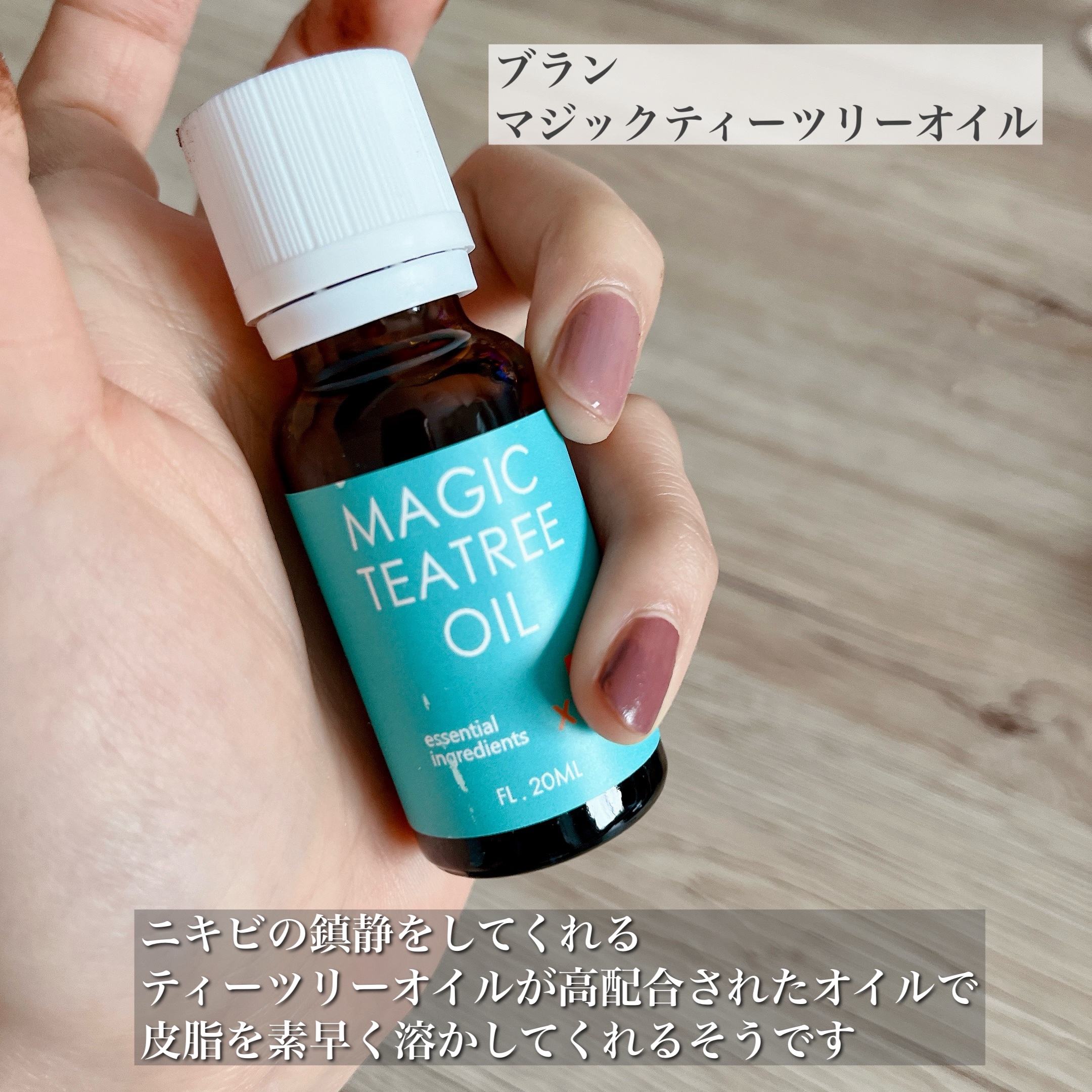 - マジックティーツリーオイルは、乾燥や皮脂による肌悩みをスポットケアし、整える商品です。ブラン代表の整肌成分である4‐テルピネオールで肌トラブルの原因の1つである皮脂を素早くケアします。 【このような方におススメ】 ✔乾燥による肌悩みが気になる方 ✔過度な皮脂と油分が気になる方 ✔べたつきのないスキンケアを探されている方 ✔肌荒れを防ぎたい方 ✔年齢性別肌タイプ関係なく使用できる商品を探されている方 【使用方法】 ①洗顔後、コットンに適量を取り、軽くふき取った後馴染ませます。 ②気になる部分の肌をきれいに洗顔後、トナー→クリームの順でお肌を整えます。 ③綿棒に1~2滴落とし、気になる部分に塗ります。 経過を見て朝晩のスキンケアの最後の段階に塗ることを繰り返します。