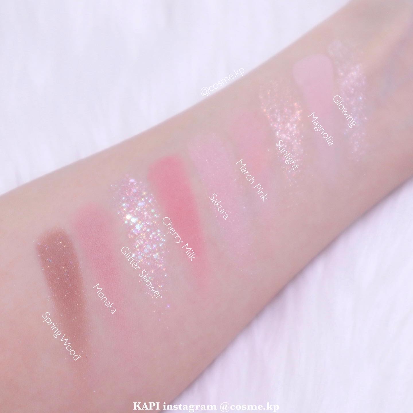 滑らかなミルクティーに淡いバラの花びらをほのかに淹れた ソフトロージーブラウンパレット☕️ˊ˗ くすみローズブラウンが最高で マット7色・シマー1色・グリッター1色のテクスチャーで使いやすい9色.ᐟ.ᐟ しっとりした粉質で粉飛びしにくく 淡いけどしっかり発色してくれるのが◎