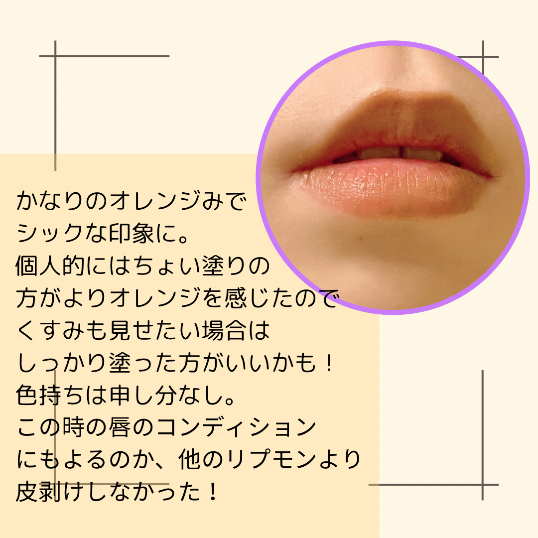 つけたての色がそのまま持続。 保湿・色持ちを兼ね備えた高発色リップ。 コップにつかない、食べたあとお直しの時間がなくてふとトイレで鏡見ても一切落ちてない、やっぱりリプモンはすごいの一言につきます。 イエベ秋大歓喜の季節になったと最近実感しています。笑