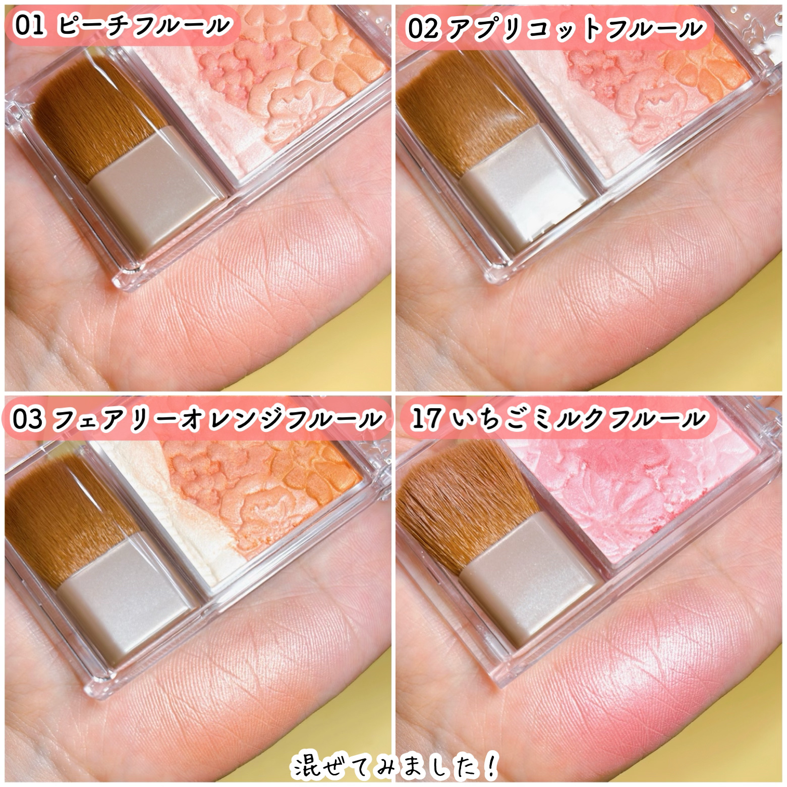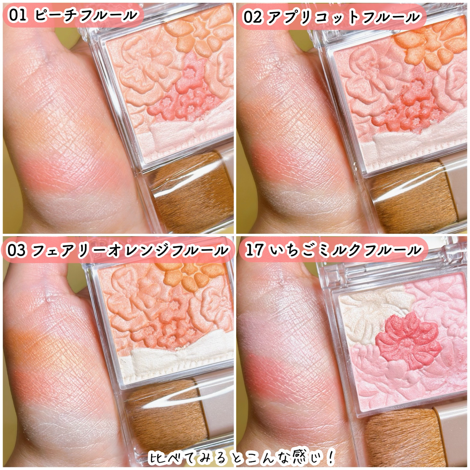 - <01 ピーチフルール> リンゴ酸ジイソステアリル、トリイソステアリン酸ポリグリセリル-2、ポリメチルシルセスキオキサン、ジメチコン、窒化ホウ素、ミリスチン酸亜鉛、ペンチレングリコール、フェノキシエタノール、メチルパラベン、トコフェロール、シリカ、イソステアリン酸オクチルドデシル、水添ロジン酸ペンタエリスリチル、水、BG、エクトイン、カニナバラ果実油、ダマスクバラ花油、ヒアルロン酸Na、ノイバラ果実エキス、ザクロ花エキス、ローズマリー葉エキス、水溶性コラーゲン、エルゴチオネイン、タルク、マイカ、酸化チタン、酸化鉄、赤226、合成フルオロフロゴパイト、水酸化Al、酸化スズ、黄4、グンジョウ <02 アプリコットフルール> リンゴ酸ジイソステアリル、トリイソステアリン酸ポリグリセリル-2、ポリメチルシルセスキオキサン、ジメチコン、窒化ホウ素、ミリスチン酸亜鉛、ペンチレングリコール、フェノキシエタノール、メチルパラベン、トコフェロール、シリカ、イソステアリン酸オクチルドデシル、水添ロジン酸ペンタエリスリチル、水、BG、エクトイン、カニナバラ果実油、ダマスクバラ花油、ヒアルロン酸Na、ノイバラ果実エキス、ザクロ花エキス、ローズマリー葉エキス、水溶性コラーゲン、エルゴチオネイン、タルク、マイカ、酸化チタン、赤226、合成フルオロフロゴパイト、酸化鉄、黄4、酸化スズ、水酸化Al、グンジョウ、赤202 <03 フェアリーオレンジフルール> リンゴ酸ジイソステアリル、トリイソステアリン酸ポリグリセリル-2、ポリメチルシルセスキオキサン、ジメチコン、窒化ホウ素、ミリスチン酸亜鉛、ペンチレングリコール、フェノキシエタノール、メチルパラベン、トコフェロール、シリカ、イソステアリン酸オクチルドデシル、水添ロジン酸ペンタエリスリチル、水、BG、エクトイン、カニナバラ果実油、ダマスクバラ花油、ヒアルロン酸Na、ノイバラ果実エキス、ザクロ花エキス、ローズマリー葉エキス、水溶性コラーゲン、エルゴチオネイン、タルク、マイカ、酸化チタン、酸化鉄、合成フルオロフロゴパイト、黄4、赤226、酸化スズ、水酸化Al <17 いちごミルクフルール> リンゴ酸ジイソステアリル、トリイソステアリン酸ポリグリセリル-2、ポリメチルシルセスキオキサン、ジメチコン、窒化ホウ素、ミリスチン酸亜鉛、ペンチレングリコール、フェノキシエタノール、メチルパラベン、トコフェロール、シリカ、イソステアリン酸オクチルドデシル、水添ロジン酸ペンタエリスリチル、水、BG、エクトイン、カニナバラ果実油、ダマスクバラ花油、ヒアルロン酸Na、ノイバラ果実エキス、ザクロ花エキス、ローズマリー葉エキス、水溶性コラーゲン、エルゴチオネイン、タルク、マイカ、酸化チタン、赤226、マンガンバイオレット、酸化鉄、酸化スズ、水酸化Al、赤202 <18 ももホイップフルール> タルク、合成フルオロフロゴパイト、リンゴ酸ジイソステアリル、トリ(カプリル酸/カプリン酸)グリセリル、ミリスチン酸亜鉛、ダイマージリノール酸(フィトステリル/イソステアリル/セチル/ステアリル/ベヘニル)、ラウロイルリシン、水添ポリデセン、シリカ、アモジメチコン、酸化スズ、エチルパラベン、メチルパラベン、水酸化Al、カプリリルグリコール、エチルヘキシルグリセリン、水、デヒドロ酢酸Na、ステアロイルグルタミン酸2Na、ジメチコン、スクワラン、BG、チャ種子油、アボカド油、アンズ核油、カニナバラ果実油、ヒアルロン酸Na、フェノキシエタノール、ブドウ種子油、ユキノシタエキス、カミツレ花エキス、トコフェロール、マイカ、酸化チタン、酸化鉄、赤226、黄4、グンジョウ、カオリン