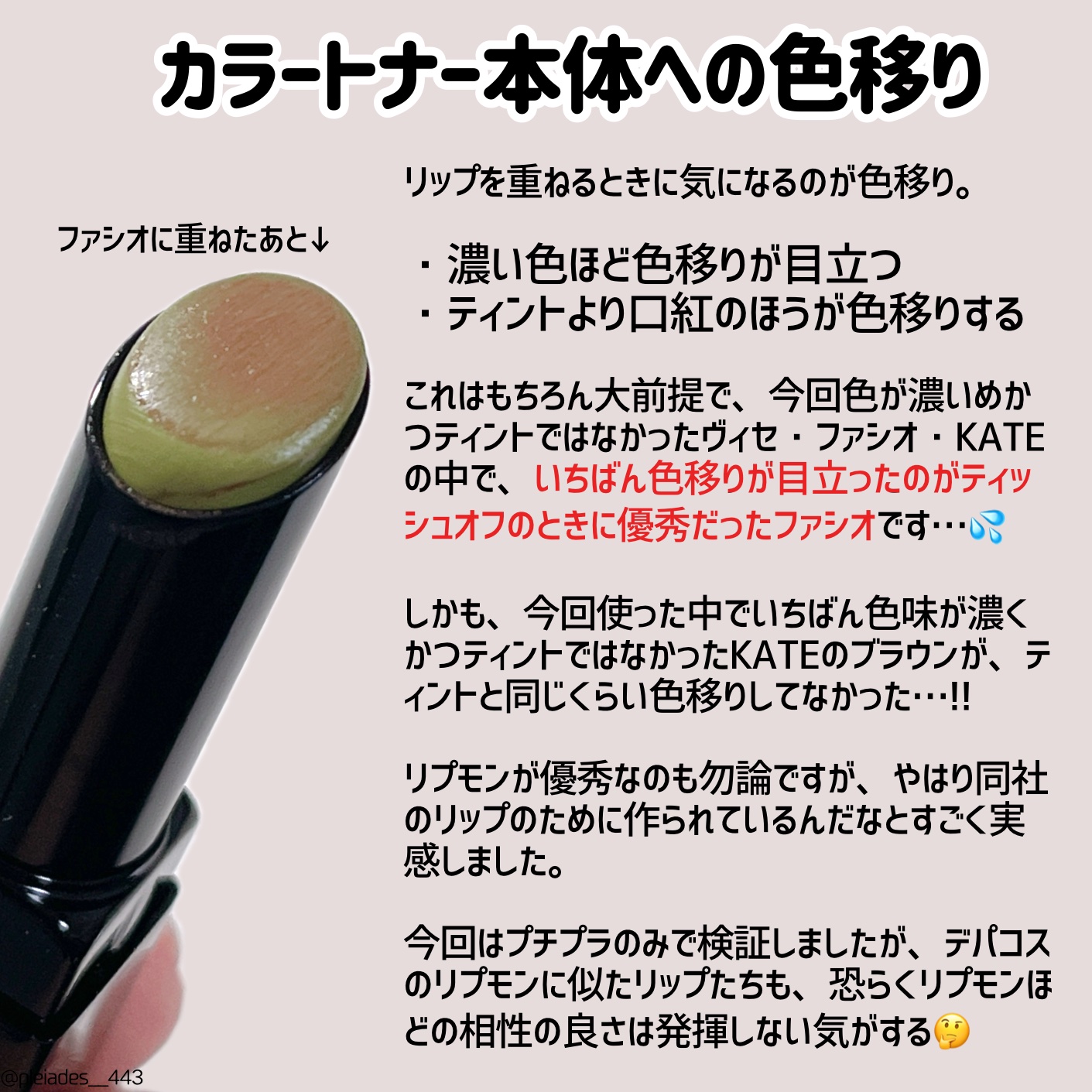 塗ってみたら素の唇とほぼ同じ色でこれぞ粘膜色って感じ! でもちゃんとメイクしてる感が出るので薄くはならずとても良い。 保湿感などの使い心地は本当に好きだし、小さいから持ち運びしやすくて良いんだけど………ここまで色が変わるとなると、ちょっと使うタイミング困る💦 こちら定番色の1~3は #ブルベ 向けっぽく書かれてるけど、これはブルベさんには厳しいだろうなと思います😢