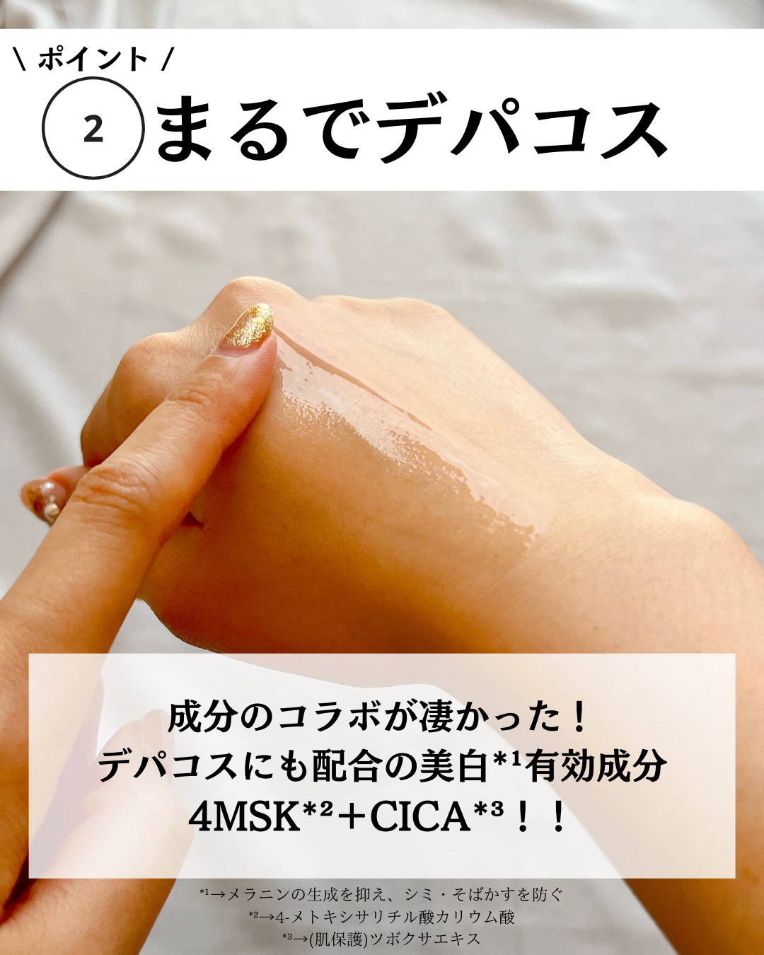 - <170mL> 有効成分 4-メトキシサリチル酸カリウム塩 その他の成分 D-グルタミン酸、DL-アラニン、DL-メチオニン、ツボクサエキス、アセチル化ヒアルロン酸ナトリウム、ヒアルロン酸ナトリウム(2)、水溶性コラーゲン(F)、濃グリセリン、精製水、ジプロピレングリコール、エタノール、マルチトール液、ポリオキシエチレン(14)ポリオキシプロピレン(7)ジメチルエーテル、1,3-ブチレングリコール、ポリオキシエチレンポリオキシプロピレンデシルテトラデシルエーテル、カルボキシビニルポリマー、キサンタンガム、水酸化カリウム、エリスリトール、アクリル酸・メタクリル酸アルキル共重合体、エデト酸二ナトリウム、2-O-エチル-L-アスコルビン酸、フェノキシエタノール、香料 <トライアル(100mL)> 有効成分 4-メトキシサリチル酸カリウム塩 その他の成分 D-グルタミン酸、DL-アラニン、DL-メチオニン、ツボクサエキス、アセチル化ヒアルロン酸ナトリウム、ヒアルロン酸ナトリウム(2)、水溶性コラーゲン(F)、濃グリセリン、精製水、ジプロピレングリコール、エタノール、マルチトール液、ポリオキシエチレン(14)ポリオキシプロピレン(7)ジメチルエーテル、1,3-ブチレングリコール、ポリオキシエチレンポリオキシプロピレンデシルテトラデシルエーテル、カルボキシビニルポリマー、キサンタンガム、水酸化カリウム、エリスリトール、アクリル酸・メタクリル酸アルキル共重合体、エデト酸二ナトリウム、2-O-エチル-L-アスコルビン酸、フェノキシエタノール、香料 <つめかえ用(150mL)> 4-メトキシサリチル酸カリウム塩、D-グルタミン酸、DL-アラニン、DL-メチオニン、ツボクサエキス、アセチル化ヒアルロン酸ナトリウム、ヒアルロン酸ナトリウム(2)、水溶性コラーゲン(F)、濃グリセリン、精製水、ジプロピレングリコール、エタノール、1,3-ブチレングリコール、ポリオキシエチレン(14)ポリオキシプロピレン(7)ジメチルエーテル、ポリエチレングリコール400、キシリット、ジグリセリン、ポリオキシエチレンポリオキシプロピレンデシルテトラデシルエーテル、カルボキシビニルポリマー、トリメチルグリシン、キサンタンガム、水酸化カリウム、エリスリトール、エデト酸二ナトリウム、2-O-エチル-L-アスコルビン酸、フェノキシエタノール、香料