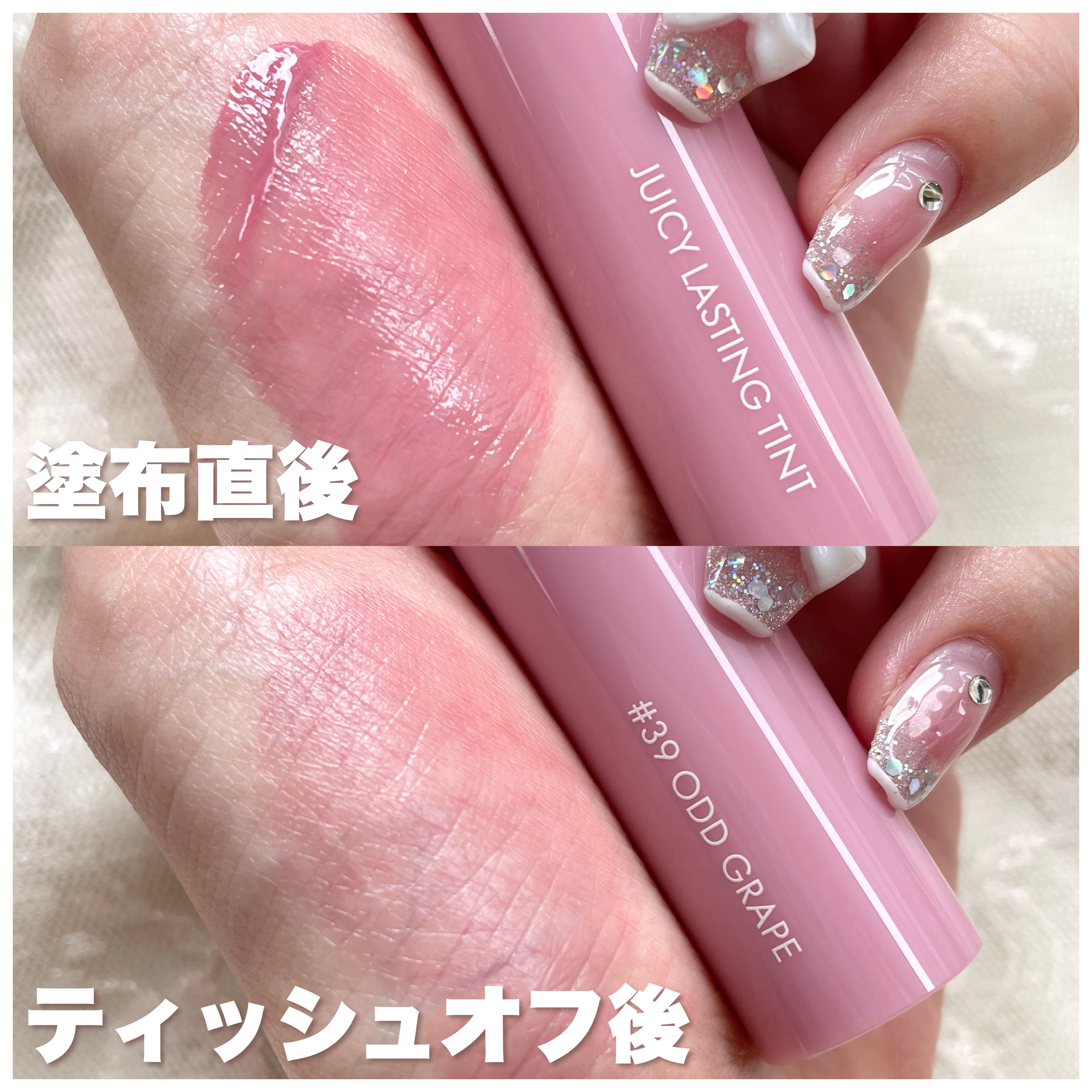 《rom&nd》ジューシーラスティングティント/39ODDGRAPE🍇𝐏𝐨𝐢𝐧𝐭🍇 ̄ ̄ ̄ ̄ ̄ ̄✔️ロムアンドが提案するフレンチコアシリーズ✔️ホワイトを一滴加えたレイジーベージュカラー✔️塗り重ねる程柔らかに深みの増す発色✔️39は爽やかなブ...