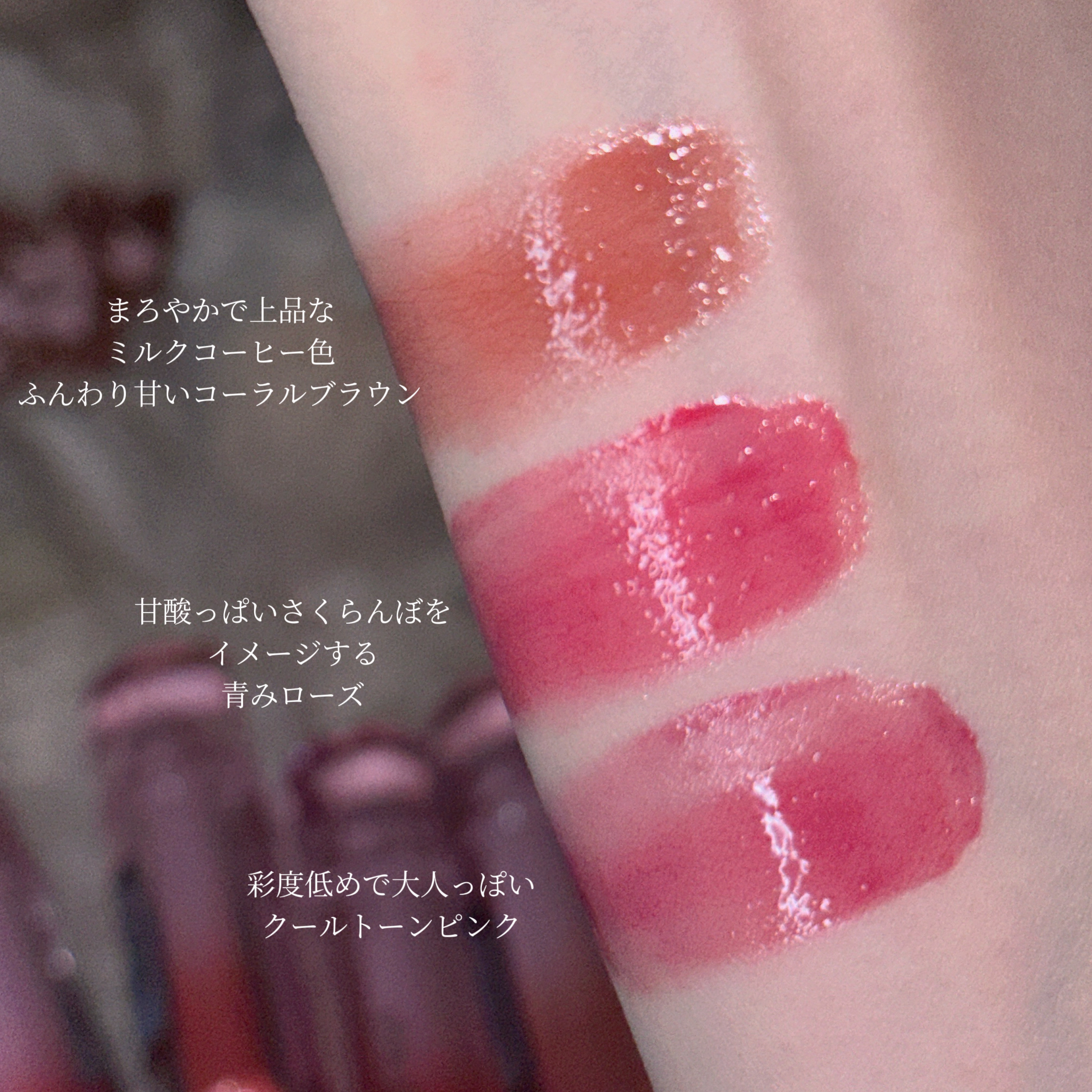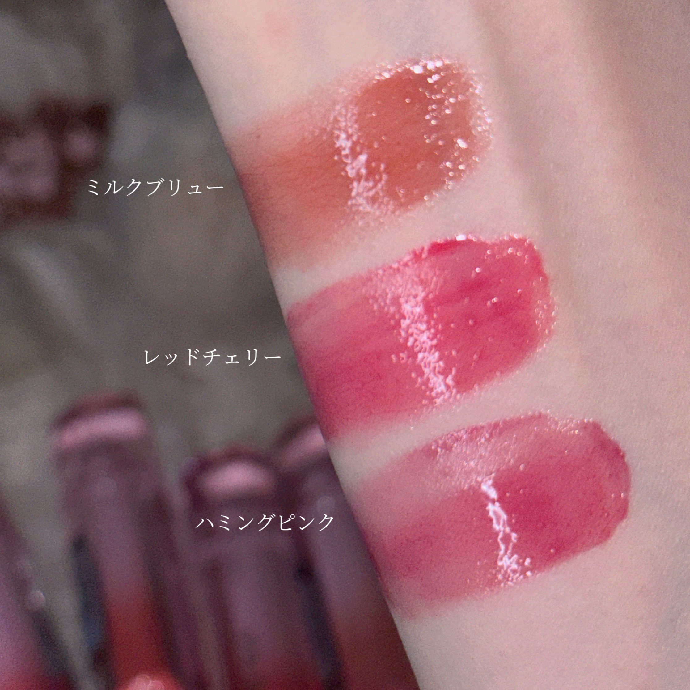 ちゅるちゅるツヤツヤ可愛い〜!!ミルクブリューって色中世ヨーロッパみたいなオシャレさと可愛さが混ざった色でかわいすぎᐡ⸝⸝> ̫ <⸝⸝ᐡハミングピンクは上品なピンクでお嬢様カラーすぎて大好き🤍