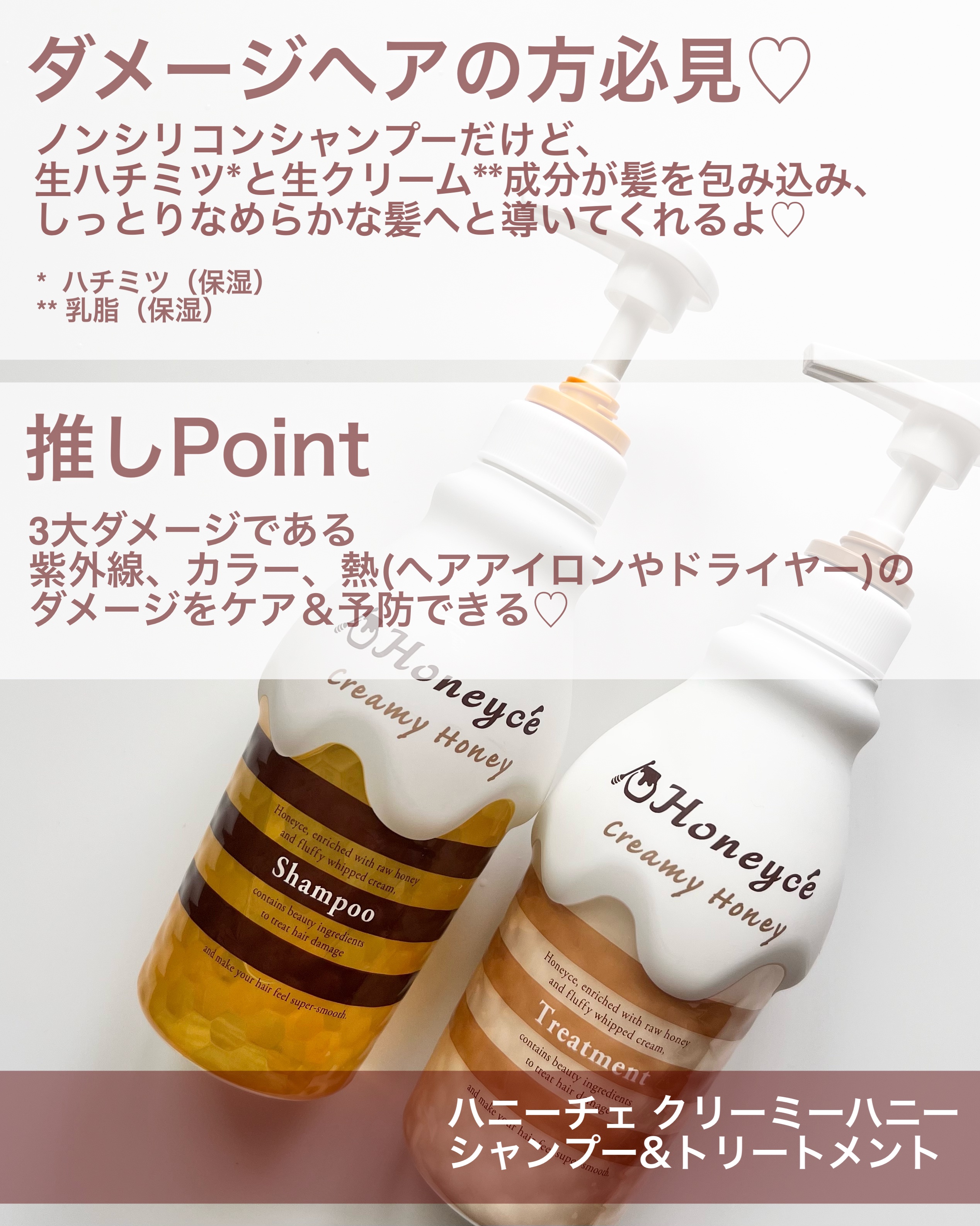 - 生ハチミツと生クリームのとろ〜りうるおいケア ●生ハチミツと生クリーム成分が髪を包みこみ、たっぷりの潤いで満たします。 ・生ハチミツ ・生クリーム ●ハチミツ由来のダメージケア&予防成分が、傷んだキューティクルに高蜜着して徹底補修するとともに新たな髪ダメージを予防します。 ・毛髪保護によるダメージ予防 ・UVダメージケア ・熱ダメージケア ・ヘアカラー・パーマダメージケア ●こだわりのフリー処方 サルフェート、合成着色料、タルク、パラフィン、鉱物油、パラベン、合成酸化防止剤、PG