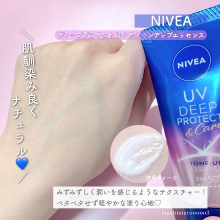ニベアUVディーププロテクト&ケアトーンアップエッセンス SPF50+・PA++++ 50gxa0(オープン価格) 日やけによるシミ予防UV*1と、 血色感をUPさせて自然に肌を明るくみせる*2 トーンアップエッセンスがこれ1本で♪ UV体制水*3(スーパーウォータープルーフ)なので汗・水に強い! だけど、単体使用ならせっけんで落とせます♪ 美容液成分(保湿)配合*4で、日やけによる シミ・そばかすを防ぎ、うるおい感ある使用感! しっとり感ある使い心地で、ピンクのエッセンスが スーっと、なめらかに伸び、まるでとろけるようにぴたっと 密着。 血色感をあげて、自然に肌を明るくみせます♪*2