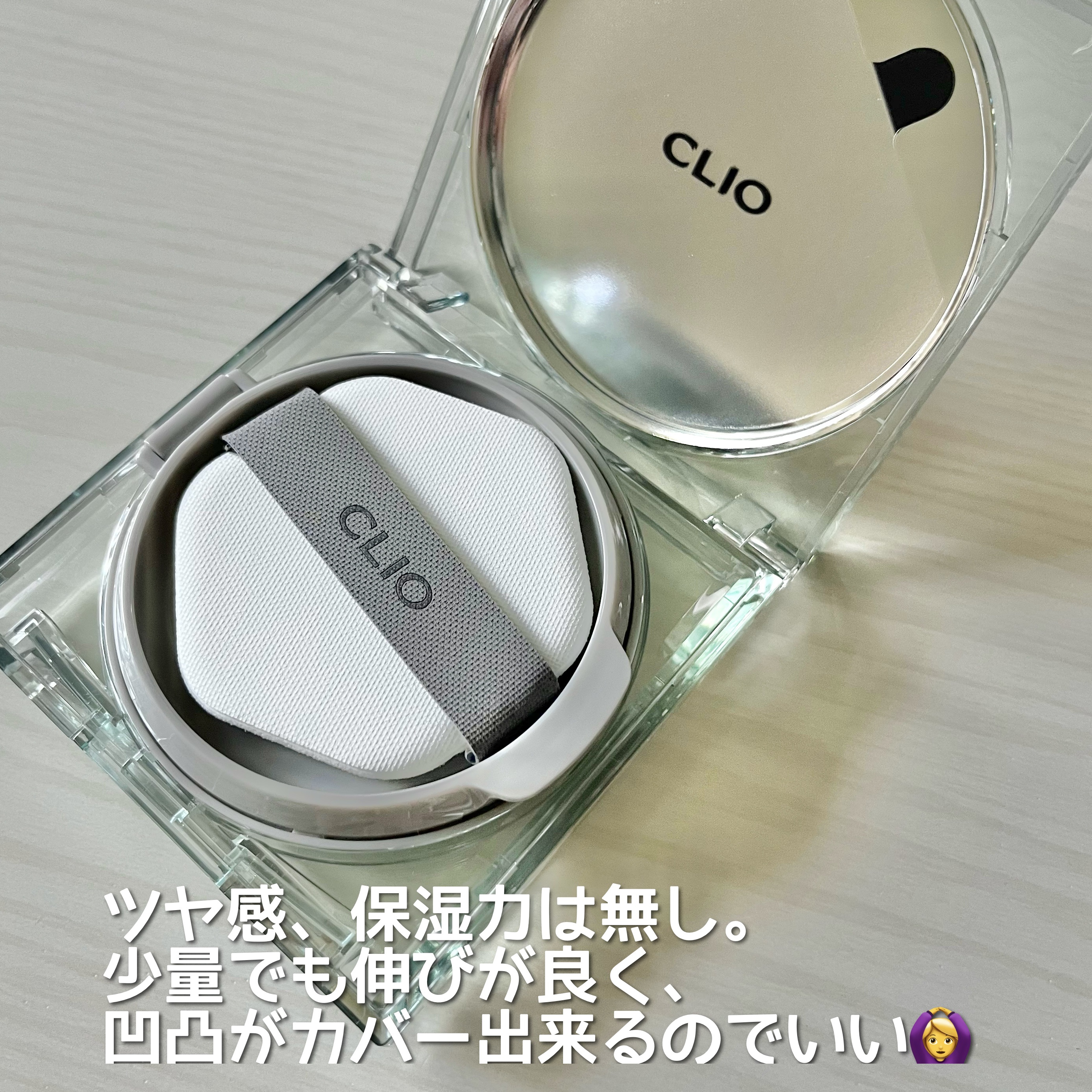 簡単に素肌のようなお肌を演出.ᐟ.ᐟ 毛穴の凸凹などをカバーして厚塗り感ないきめ細かいエアリーサテン肌へ🕊️ 崩れ方も汚くないし香りも気にならず やっぱCLIOのクッションファンデ好き🥰 これは黄みすぎない明るめカラーだから浮かなくて良かった🏹