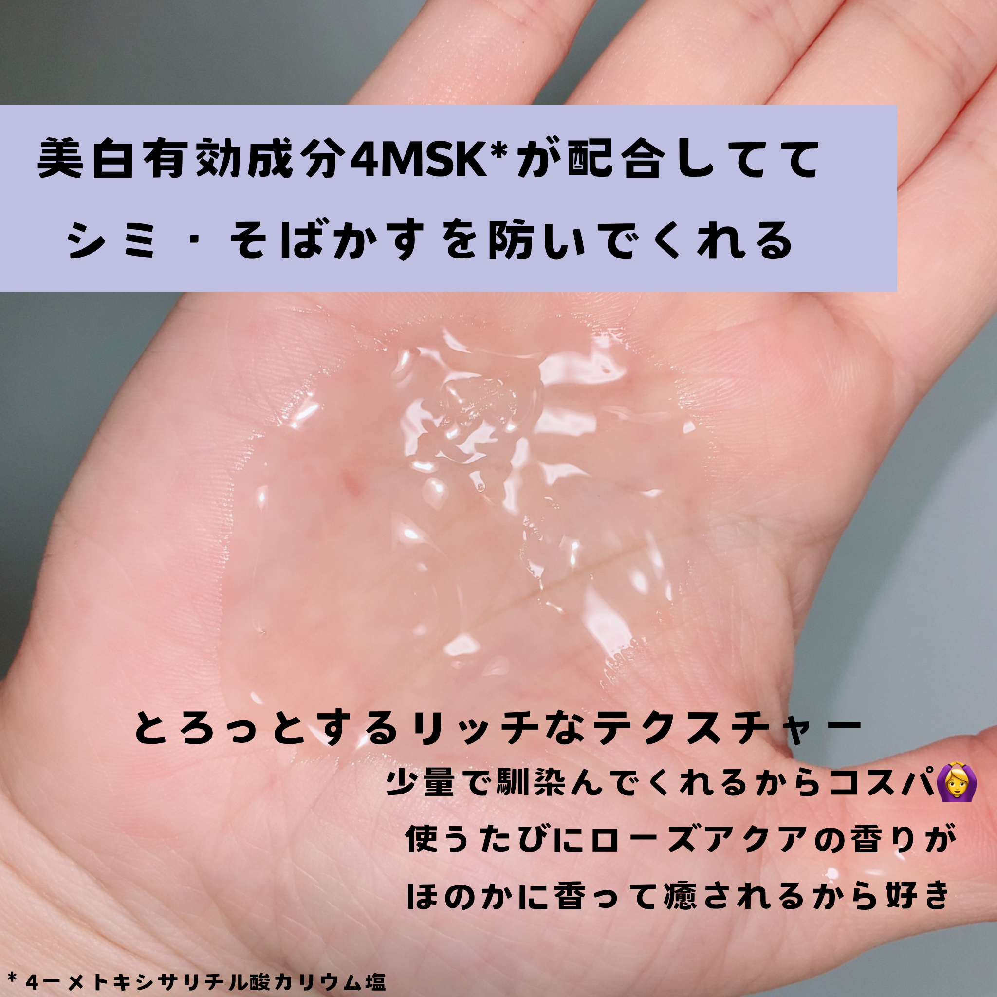 - 【医薬部外品】 <究極の成分コラボ>4MSK*1+CICA*2配合の本気の成分アプローチ 美容液級 美白化粧水 デパコスにも配合の美白*3有効成分4MSK*1がシミのもとに直行。シミ・そばかすを防ぎ、うるおって明るく透明感のある肌へ。 肌を保護するCICA*2、浸透美容アミノ酸*4、Wヒアルロン酸*5、コラーゲンGL*6など、美肌に導く成分を贅沢に配合。 資生堂サロン&スパ エステティシャン監修の、美容液のような心地よい繊細なとろみ液が、キメの奥までじゅわ~っと浸透*7。 優しく香るローズアクアの香りが、快適度を高めます。 「しっとり」と「とてもしっとり」の2タイプがあり、お好みの使用感でお選びいただけます。 *1 メラニンの生成を抑え、シミ・そばかすを防ぐ *2 4-メトキシサリチル酸カリウム塩 *3 (肌保護)ツボクサエキス *4 (うるおい保持成分)D-グルタミン酸、DL-アラニン、DL-メチオニン *5 (保湿成分)アセチル化ヒアルロン酸Na、ヒアルロン酸Na *6 (保湿成分)水溶性コラーゲン、グリセリン *7 角層まで