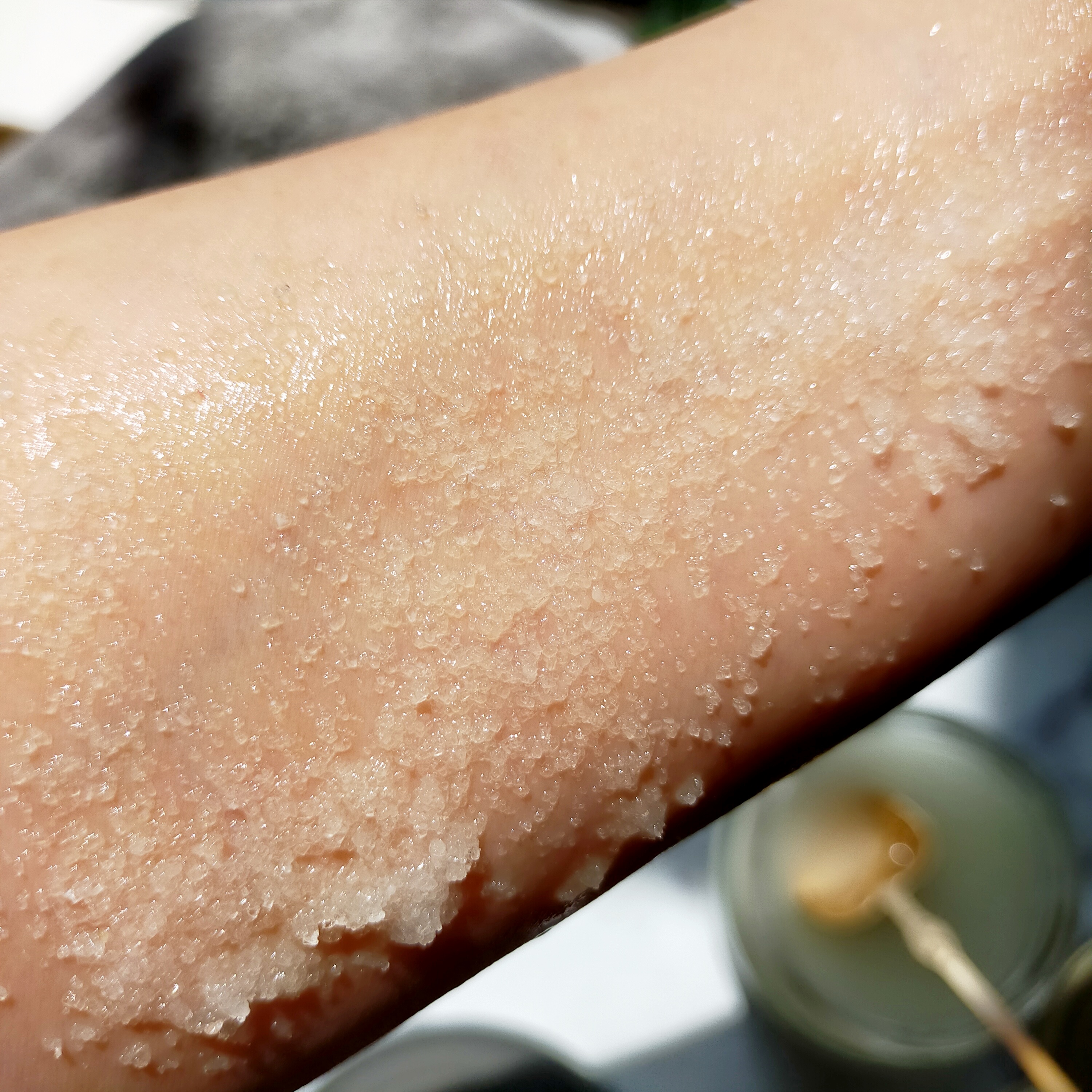 死海の湖泥と塩でお肌をケアするボディスクラブです(*1整肌成分と洗浄補助成分の海シルトと*2洗浄補助成分の海塩)🙆🏻♂️ ヒノキやユーカリなどのグーリン系の香りとなっており、シャリシャリしたシャーベット状のテクスチャーになります😉✨ 使用後はスベスベなのにしっとりとしたお肌になりました🥰