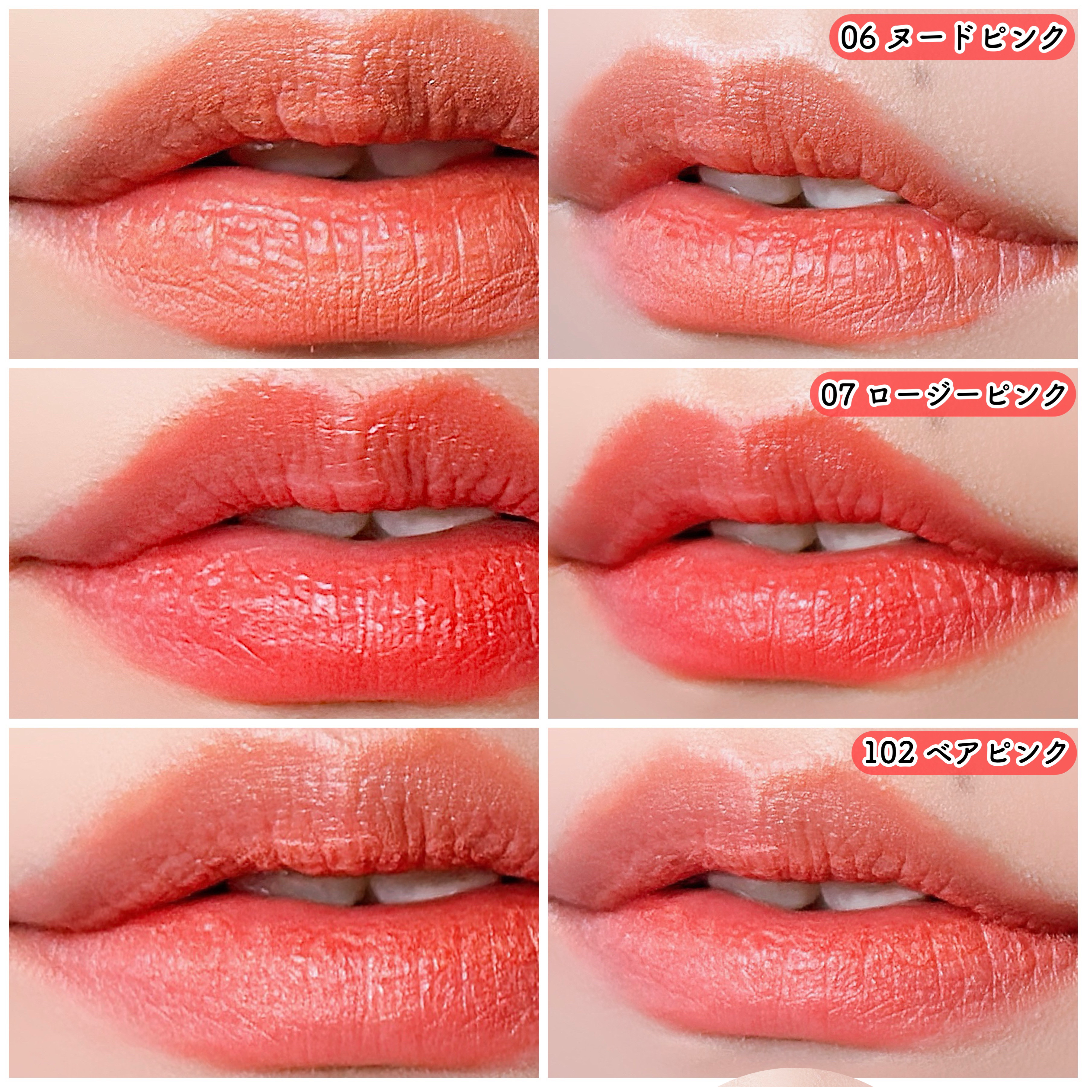 ✿チジャベージュは透け感のあるオレンジ🍊 ✿ポメロスキンはベージュブラウン ✿ヌカダミアはレッドブラウン ✿ヌーディピーナッツはオレンジコーラル🍑 ✿インコーラルはピンクレッド ✿コットンメルバは白味ピンク ✿ソルベバームは元気なオレンジレッド!