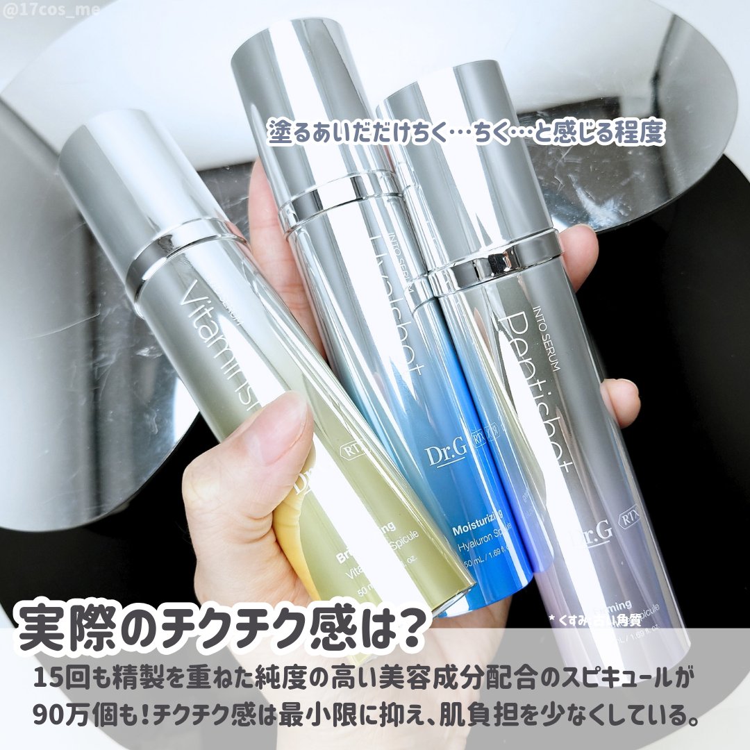 美容成分を浸透させるためのニードルではなく、ニードル自身に美容成分を入れた第三世代のスピキュール美容液。3種類の美容液で美白ケア・水分ケア・ハリ弾力ケア! スピキュールが90万個も入っているそうで、短期間で肌の変化が感じられるそうです。 ドクターズコスメのDr.Gだからこその攻めのケア!ぜひメガ割でチェックしてみてね
