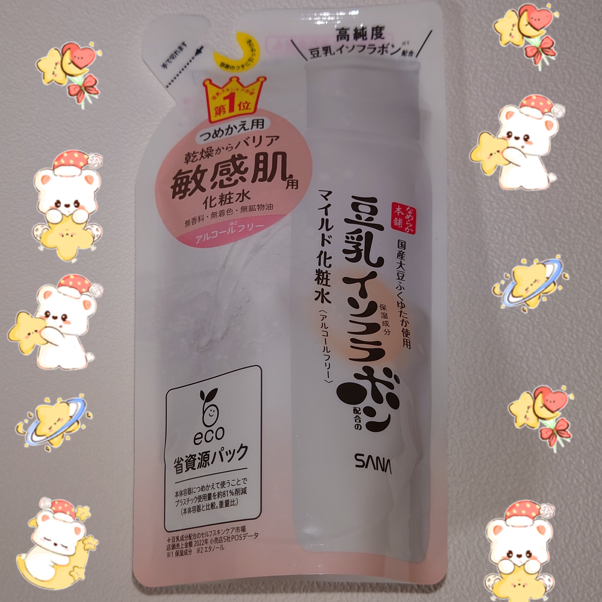 - <本体 200ml> 水、BG、DPG、ジグリセリン、メチルグルセス-20、ベタイン、豆乳イソフラボン、豆乳発酵液、セラミドNG、グリチルリチン酸2K、アルギニン、カルボマー、キサンタンガム、クエン酸、クエン酸Na、シクロデキストリン、フィトステロールズ、ポリアクリル酸Na、ポリクオタニウム-51、メチルグルセス-10、ラウリン酸スクロース、水酸化K、水添レシチン、フェノキシエタノール、メチルパラベン <つめかえ用 180ml> 水、BG、DPG、ジグリセリン、メチルグルセス-20、ベタイン、豆乳イソフラボン、豆乳発酵液、セラミドNG、グリチルリチン酸2K、アルギニン、カルボマー、キサンタンガム、クエン酸、クエン酸Na、シクロデキストリン、フィトステロールズ、ポリアクリル酸Na、ポリクオタニウム-51、メチルグルセス-10、ラウリン酸スクロース、水酸化K、水添レシチン、フェノキシエタノール、メチルパラベン