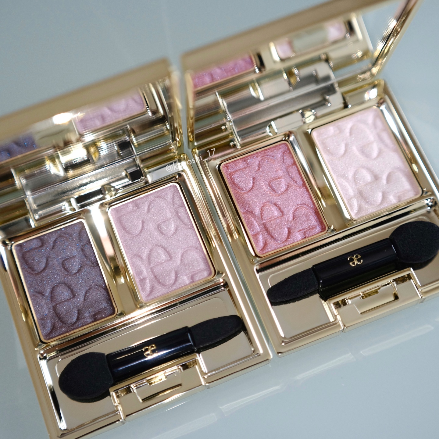 湿式のピンクはくすみを飛ばしてくれて、涙袋に使うのも可愛いです💓 左下のブラウンは、ピンクに重ねることで発色の綺麗さが増します🙆🏻♀️🙆🏻♂️ 右下のブラウンは小さなラメが入っていて控えめにチラッときらめきます💎 湿式のアイシャドウはうっかりすると二重の線に溜まりますつける量やぼかし方で解決します🥰
