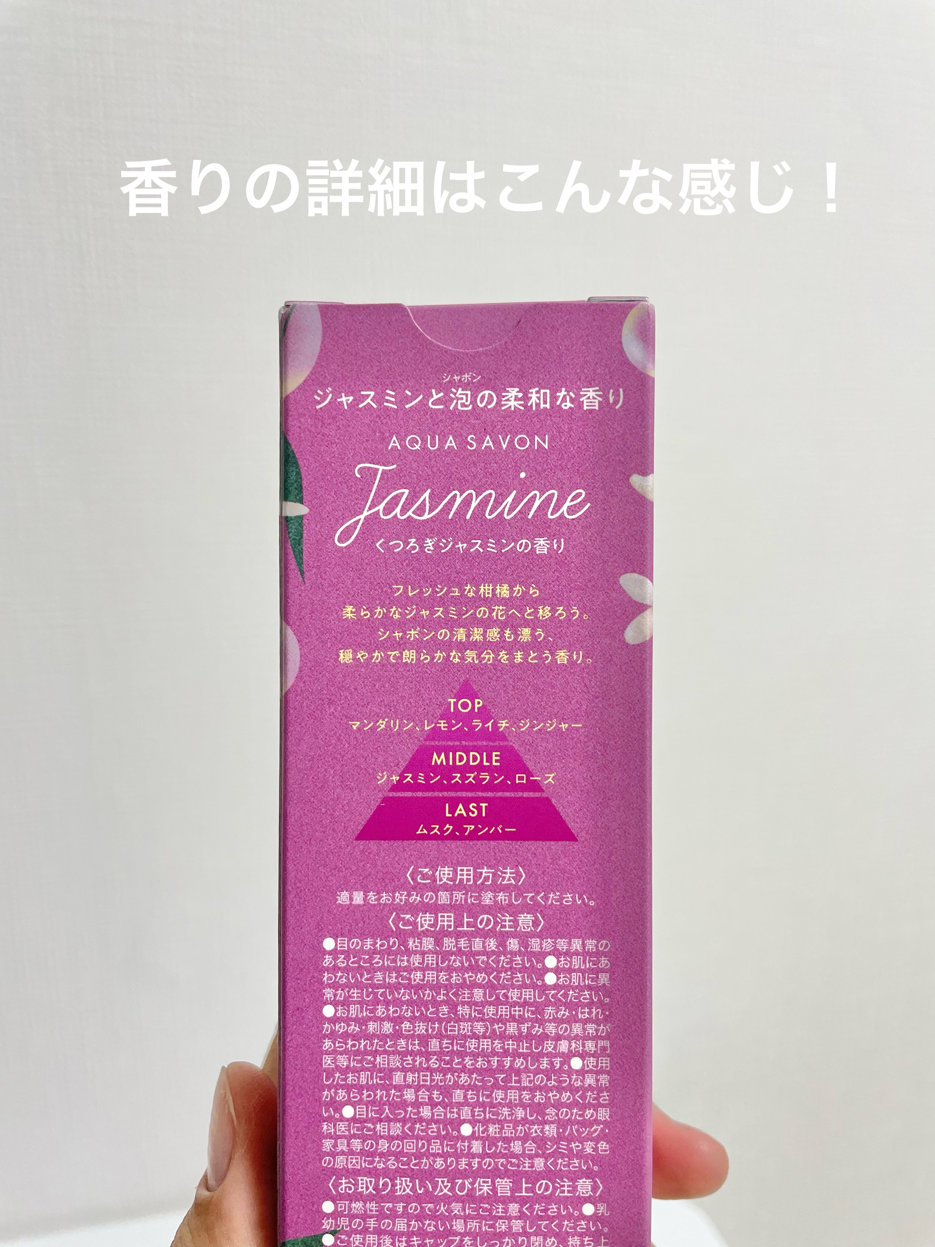 アクアシャボンくつろぎジャスミンの香りオードトワレ80ml¥2750らしいアマゾンで¥1700だったハゴロモジャスミンが好きかもしれなくてこのくつろぎジャスミンはハゴロモジャスミンをモチーフに〜って書いてあったから購入してみた結論は全く好きじ...