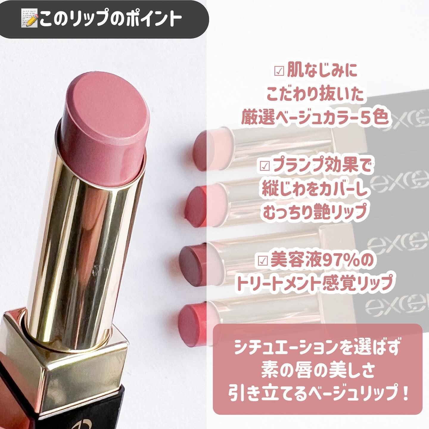 - 永遠に変わらない魅力を秘めたベージュだけを厳選した、極上ニュアンスカラーの美容液リップです。 とろけるようなテクスチャー、絶妙な色味、プランプ効果*1のすべてを叶える絶妙なバランスを追求し、発売まで2年を要したこだわりのアイテムです。 どんなシチュエーションにも合わせられ、素の唇の美しさを引き立てる極上ベージュカラー。 どなたでも似合う“運命の1本”が見つかるニュアンスカラーラインアップです。 程よいシアーな発色で唇の血色感も残しつつ、ベージュの中に赤みを数滴混ぜたような絶妙カラーだけを厳選しました。 プランプ効果*1でふっくら艶めく唇を演出し、ひと塗りで気になる乾燥を予防し唇の縦じわをカバーします*1。 唇の上にとろけるようなオイル膜を形成し、ぴたっと密着してヨレを防ぎます。 美容液97%*2のトリートメント感覚リップです。 *1 メイクアップ効果による *2 仕上がり効果粉末を除く成分 4月9日よりエクセル公式オンラインショップ及び amazon にて先行販売