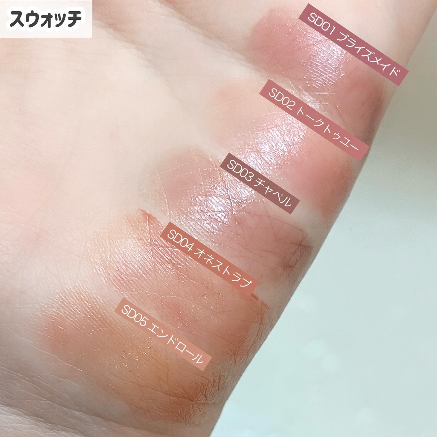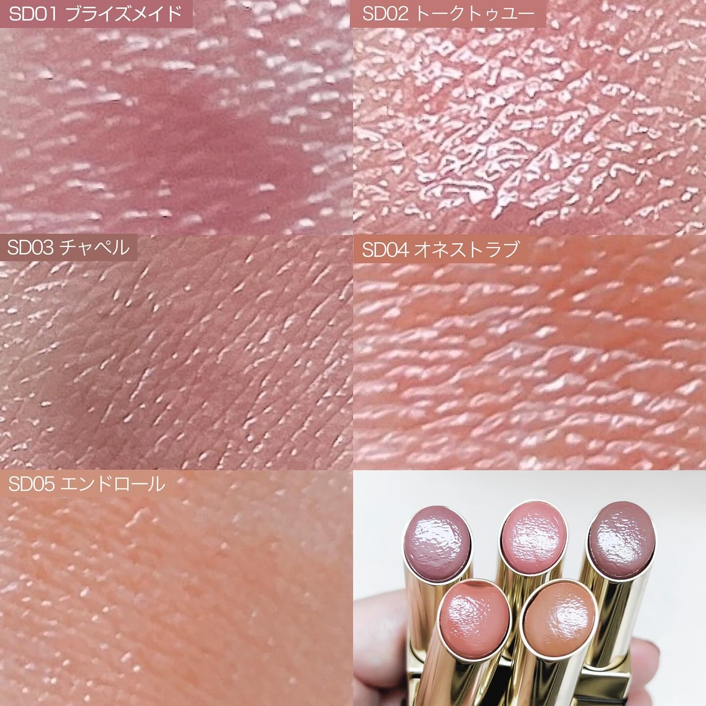 - <SD01 ブライズメイド> 水添ポリイソブテン、トリエチルヘキサノイン、ダイマージリノール酸ジ(イソステアリル/フィトステリル)、デカイソステアリン酸ポリグリセリル-10、トリメチルペンタフェニルトリシロキサン、合成ワックス、リンゴ酸ジイソステアリル、ジフェニルシロキシフェニルトリメチコン、ワセリン、トリメチルシロキシフェニルジメチコン、マイクロクリスタリンワックス、バニリルブチル、メントキシプロパンジオール、ヒアルロン酸クロスポリマーNa、加水分解コラーゲン、ホホバ種子油、オリーブ果実油、ブドウ種子油、マカデミア種子油、アボカド油、アルガニアスピノサ核油、カニナバラ果実油、アーモンド油、アンズ核油、メドウフォーム種子油、(ジイソステアリン酸/ポリヒドロキシステアリン酸/セバシン酸)ポリグリセリル-4、イソステアリン酸Na、カルナウバロウ、キャンデリラロウエステルズ、ステアリン酸エチルヘキシル、セスキイソステアリン酸ソルビタン、トコフェロール、ハイドロゲンジメチコン、ホウケイ酸(Ca/Al)、水、(+/-)シリカ、ラウロイルリシン、黄4、黄5、酸化チタン、酸化鉄、水酸化Al、青1、赤201、赤202 <SD02 トークトゥユー > 水添ポリイソブテン、トリエチルヘキサノイン、ダイマージリノール酸ジ(イソステアリル/フィトステリル)、デカイソステアリン酸ポリグリセリル-10、トリメチルペンタフェニルトリシロキサン、合成ワックス、リンゴ酸ジイソステアリル、ジフェニルシロキシフェニルトリメチコン、ワセリン、トリメチルシロキシフェニルジメチコン、マイクロクリスタリンワックス、バニリルブチル、メントキシプロパンジオール、ヒアルロン酸クロスポリマーNa、加水分解コラーゲン、ホホバ種子油、オリーブ果実油、ブドウ種子油、マカデミア種子油、アボカド油、アルガニアスピノサ核油、カニナバラ果実油、アーモンド油、アンズ核油、メドウフォーム種子油、(ジイソステアリン酸/ポリヒドロキシステアリン酸/セバシン酸)ポリグリセリル-4、イソステアリン酸Na、カルナウバロウ、キャンデリラロウエステルズ、ステアリン酸エチルヘキシル、セスキイソステアリン酸ソルビタン、トコフェロール、ハイドロゲンジメチコン、ホウケイ酸(Ca/Al)、水、(+/-)シリカ、ラウロイルリシン、黄4、黄5、酸化チタン、酸化鉄、水酸化Al、青1、赤201、赤202 <SD03 チャペル> 水添ポリイソブテン、トリエチルヘキサノイン、ダイマージリノール酸ジ(イソステアリル/フィトステリル)、デカイソステアリン酸ポリグリセリル-10、トリメチルペンタフェニルトリシロキサン、合成ワックス、リンゴ酸ジイソステアリル、ジフェニルシロキシフェニルトリメチコン、ワセリン、トリメチルシロキシフェニルジメチコン、マイクロクリスタリンワックス、バニリルブチル、メントキシプロパンジオール、ヒアルロン酸クロスポリマーNa、加水分解コラーゲン、ホホバ種子油、オリーブ果実油、ブドウ種子油、マカデミア種子油、アボカド油、アルガニアスピノサ核油、カニナバラ果実油、アーモンド油、アンズ核油、メドウフォーム種子油、(ジイソステアリン酸/ポリヒドロキシステアリン酸/セバシン酸)ポリグリセリル-4、イソステアリン酸Na、カルナウバロウ、キャンデリラロウエステルズ、ステアリン酸エチルヘキシル、セスキイソステアリン酸ソルビタン、トコフェロール、ハイドロゲンジメチコン、ホウケイ酸(Ca/Al)、水、(+/-)シリカ、ラウロイルリシン、黄4、黄5、酸化チタン、酸化鉄、水酸化Al、青1、赤201、赤202 <SD04 オネストラブ> 水添ポリイソブテン、トリエチルヘキサノイン、ダイマージリノール酸ジ(イソステアリル/フィトステリル)、デカイソステアリン酸ポリグリセリル-10、トリメチルペンタフェニルトリシロキサン、合成ワックス、リンゴ酸ジイソステアリル、ジフェニルシロキシフェニルトリメチコン、ワセリン、トリメチルシロキシフェニルジメチコン、マイクロクリスタリンワックス、バニリルブチル、メントキシプロパンジオール、ヒアルロン酸クロスポリマーNa、加水分解コラーゲン、ホホバ種子油、オリーブ果実油、ブドウ種子油、マカデミア種子油、アボカド油、アルガニアスピノサ核油、カニナバラ果実油、アーモンド油、アンズ核油、メドウフォーム種子油、(ジイソステアリン酸/ポリヒドロキシステアリン酸/セバシン酸)ポリグリセリル-4、イソステアリン酸Na、カルナウバロウ、キャンデリラロウエステルズ、ステアリン酸エチルヘキシル、セスキイソステアリン酸ソルビタン、トコフェロール、ハイドロゲンジメチコン、ホウケイ酸(Ca/Al)、水、(+/-)シリカ、ラウロイルリシン、黄4、黄5、酸化チタン、酸化鉄、水酸化Al、青1、赤201、赤202 <SD05 エンドロール> 水添ポリイソブテン、トリエチルヘキサノイン、ダイマージリノール酸ジ(イソステアリル/フィトステリル)、デカイソステアリン酸ポリグリセリル-10、トリメチルペンタフェニルトリシロキサ