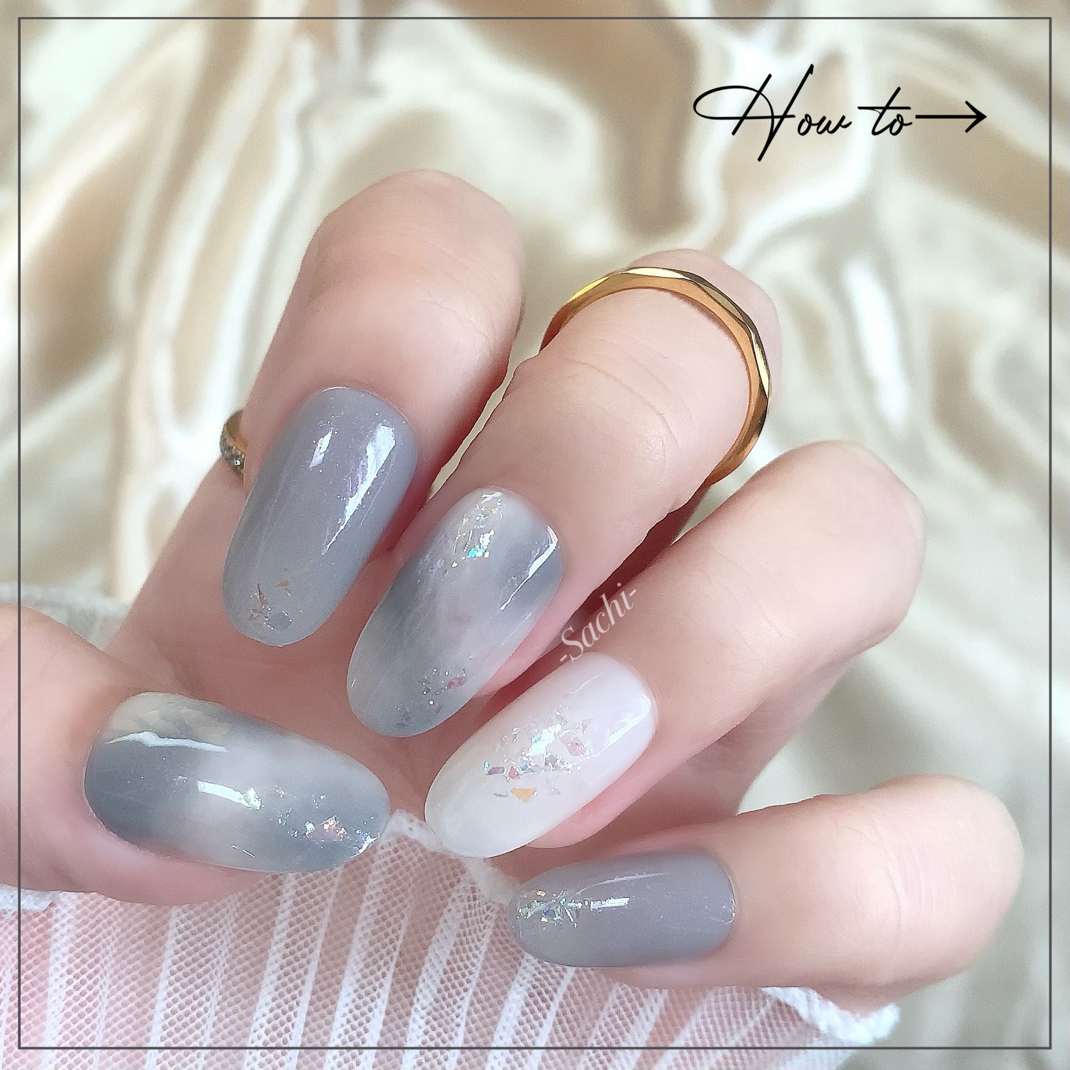 ワンカラーでも指ごとに色を変えるだけでオシャレに見えます💕 画像のようにゴールドラインとストーンを少し足すだけで華やかさがアップ🥰 何度かご紹介したことのあるスポンジで作るグラデーションです✨ スポンジを使うことで境目が綺麗に馴染んでくれます💕 アルミホイルの上でブラウンとトップコートを1:1くらいで混ぜたものを、トップコートのハケに取って3箇所に塗るだけ👌 事前に混ぜたものを塗ることで、爪の上でぼかすより簡単に出来ます💕 ベースカラーが乾く前に点置きしてぼかすことで綺麗にぼかせます✨ スピードが大事なので、使うポリッシュのキャップは全て開けておきましょう😊 天然石のラインはガタガタの方がより天然石っぽく見えるので、ラインを描くのが苦手な方でも大丈夫🙆♀️ 難しそうに見えて、やってみると意外と簡単に出来ます♡