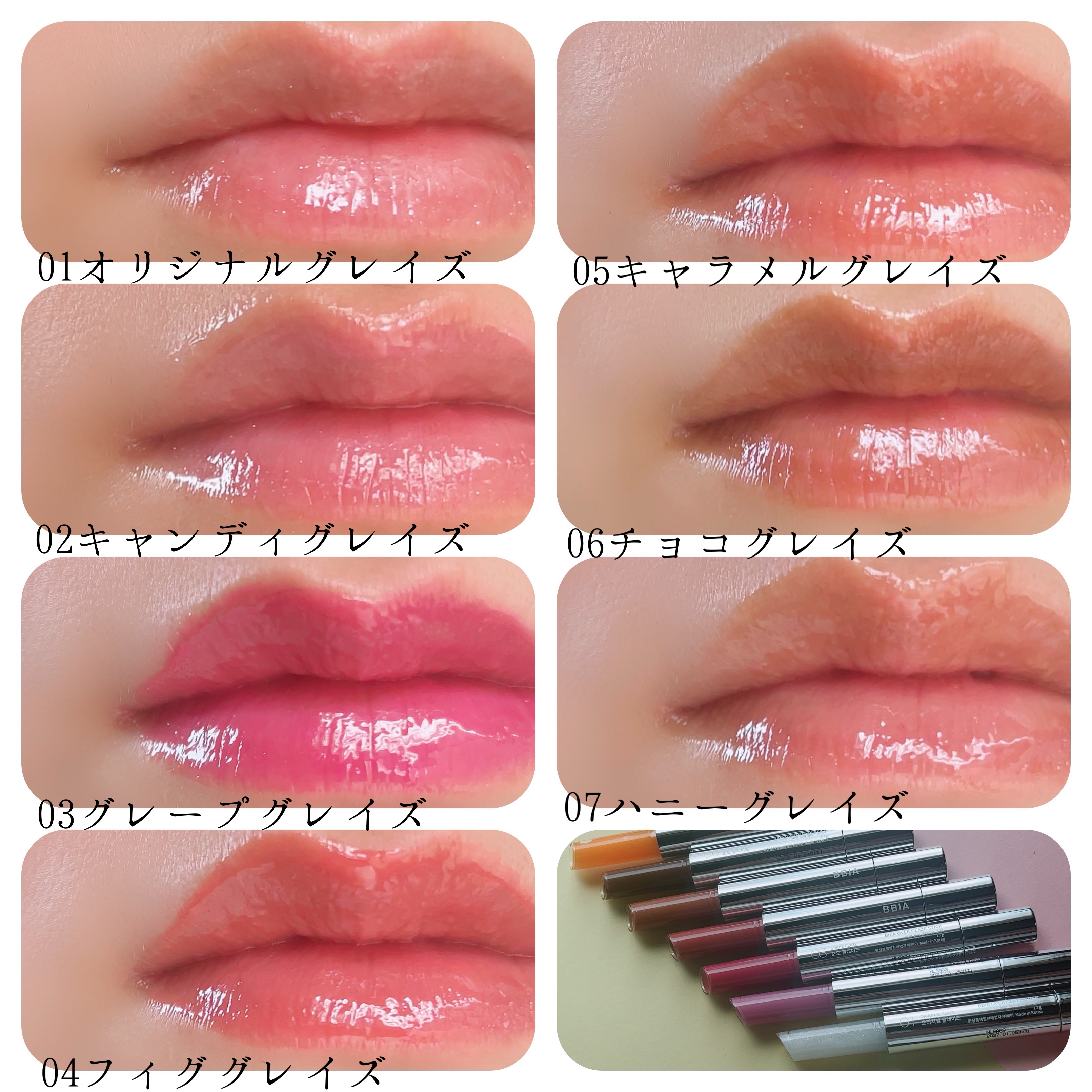 - <01 オリジナルグレイズ> ダイマージリノール酸(フィトステリル/イソステアリル/セチル/ステアリル/ベヘニル)、リンゴ酸ジイソステアリル、水添ポリイソブテン、ジ安息香酸PG、トリイソステアリン酸ポリグリセリル-2、セレシン、ポリヒドロキシステアリン酸、乳酸メンチル、合成ワックス、シリカ、(エチレン/プロピレン)コポリマー、(カプリル酸/カプリン酸)グリセリル、ホウケイ酸(Ca/チタン、エチルヘキシルグリセリン、香料、酸化チタン、酸化スズ、アボカド油、ツバキ種子油、プルーン種子油、アルガニアスピノサ核油、水、BG、ハチミツエキス、フェノキシエタノール <02 キャンディグレイズ> ダイマージリノール酸(フィトステリル/イソステアリル/セチル/ステアリル/ベヘニル)、リンゴ酸ジイソステアリル、水添ポリイソブテン、ジ安息香酸PG、トリイソステアリン酸ポリグリセリル-2、セレシン、ポリヒドロキシステアリン酸、乳酸メンチル、合成ワックス、シリカ、(エチレン/プロピレン)コポリマー、(カプリル酸/カプリン酸)グリセリル、酸化チタン、エチルヘキシルグリセリン、香料、赤202、黄4、青1、水酸化Al、アボカド油、ツバキ種子油、プルーン種子油、アルガニアスピノサ核油、水、BG、ハチミツエキス、フェノキシエタノール <03 グレープグレイズ> ダイマージリノール酸(フィトステリル/イソステアリル/セチル/ステアリル/ベヘニル)、水添ポリイソブテン、リンゴ酸ジイソステアリル、ジ安息香酸PG、トリイソステアリン酸ポリグリセリル-2、セレシン、乳酸メンチル、ポリヒドロキシステアリン酸、合成ワックス、シリカ、(エチレン/プロピレン)コポリマー、酸化チタン、(カプリル酸/カプリン酸)グリセリル、エチルヘキシルグリセリン、赤202、酸化鉄、黄5、香料、水酸化Al、アボカド油、ツバキ種子油、プルーン種子油、アルガニアスピノサ核油、水、BG、ハチミツエキス、フェノキシエタノール <04 フィググレイズ> ダイマージリノール酸(フィトステリル/イソステアリル/セチル/ステアリル/ベヘニル)、水添ポリイソブテン、リンゴ酸ジイソステアリル、ジ安息香酸PG、トリイソステアリン酸ポリグリセリル-2、セレシン、ポリヒドロキシステアリン酸、乳酸メンチル、合成ワックス、シリカ、(エチレン/プロピレン)コポリマー、酸化チタン、(カプリル酸/カプリン酸)グリセリル、酸化鉄、エチルヘキシルグリセリン、香料、赤202、黄4、青1、水酸化Al、トリイソステアリン酸イソプロピルチタン、アボカド油、ツバキ種子油、プルーン種子油、アルガニアスピノサ核油、水、BG、ハチミツエキス、フェノキシエタノール <05 キャラメルグレイズ> ダイマージリノール酸(フィトステリル/、イソステアリル/セチル/ステアリル/ベヘニル)、水添ポリイソブテン、リンゴ酸ジイソステアリル、ジ安息香酸PG、トリイソステアリン酸ポリグリセリル-2、セレシン、乳酸メンチル、ポリヒドロキシステアリン酸、合成ワックス、シリカ、(エチレン/プロピレン)コポリマー、(カプリル酸/カプリン酸)グリセリル、酸化チタン、酸化鉄、エチルヘキシルグリセリン、ホウケイ酸(Ca/チタン)、香料、赤202、水酸化Al、トリイソステアリン酸イソプロピルチタン、プルーン種子油、アルガニアスピノサ核油、アボカド油、ツバキ種子油、水、酸化スズ、BG、ハチミツエキス、フェノキシエタノール <06 チョコグレイズ> ダイマージリノール酸(フィトステリル/イソステアリル/セチル/ステアリル/ベヘニル)、リンゴ酸ジイソステアリル、水添ポリイソブテン、ジ安息香酸PG、トリイソステアリン酸ポリグリセリル-2、セレシン、ポリヒドロキシステアリン酸、乳酸メンチル、合成ワックス、シリカ、(エチレン/プロピレン)コポリマー、(カプリル酸/カプリン酸)グリセリル、酸化鉄、エチルヘキシルグリセリン、香料、赤202、トリイソステアリン酸イソプロピルチタン、ツバキ種子油、プルーン種子油、アルガニアスピノサ核油、アボカド油、水、BG、ハチミツエキス <07 ハニーグレイズ> ダイマージリノール酸(フィトステリル/イソステアリル/セチル/ステアリル/ベヘニル)、リンゴ酸ジイソステアリル、水添ポリイソブテン、ジ安息香酸PG、トリイソステアリン酸ポリグリセリル-2、セレシン、ポリヒドロキシステアリン酸、乳酸メンチル、合成ワックス、シリカ、(エチレン/プロピレン)コポリマー、(カプリル酸/カプリン酸)グリセリル、エチルヘキシルグリセリン、黄4、香料、黄5、プルーン種子油、アルガニアスピノサ核油、アボカド油、ツバキ種子油、水、BG、ハチミツエキス、フェノキシエタノール