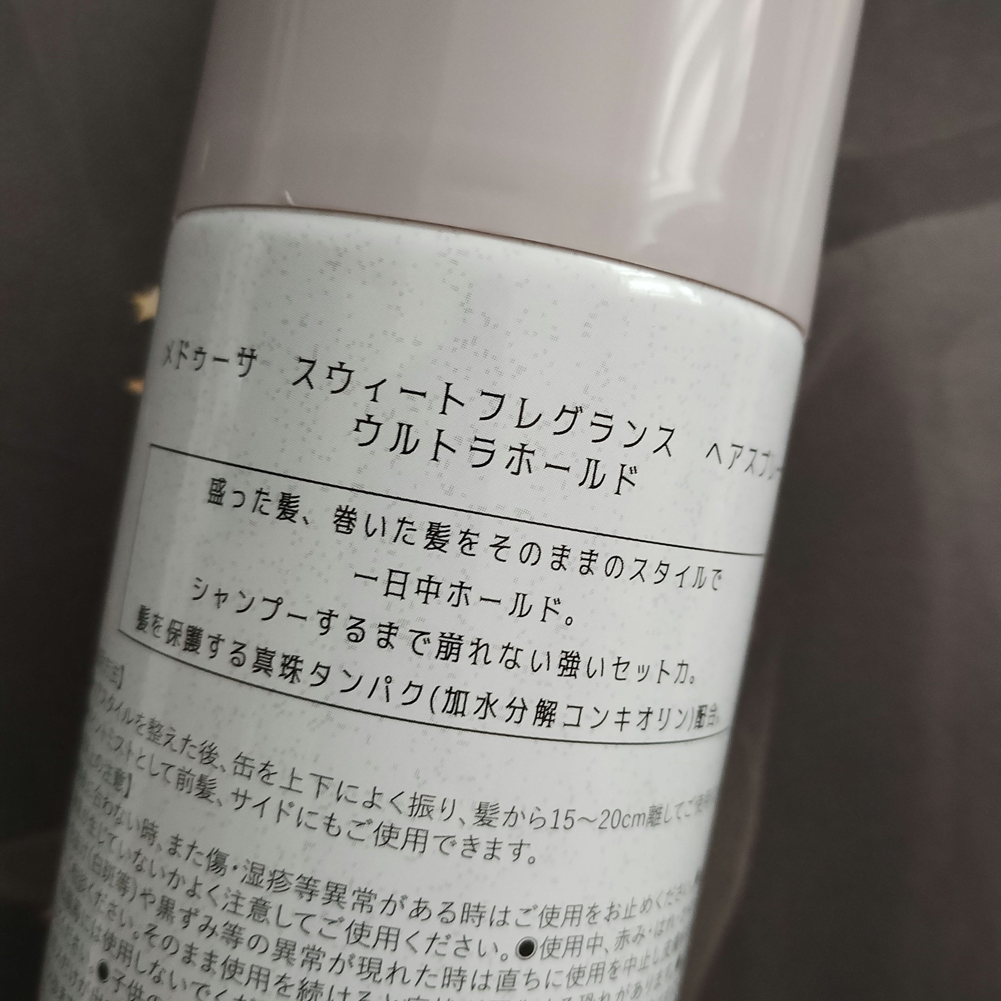 - 長時間香るヘアスプレー。魔性の香りメドゥーサスウィートフレグランス。盛った髪、巻いた髪をそのままのスタイルで長時間ホールド。シャンプーするまで崩れを防ぐ強いセット力。髪を保護する真珠タンパク(加水分解コンキオリン)配合。