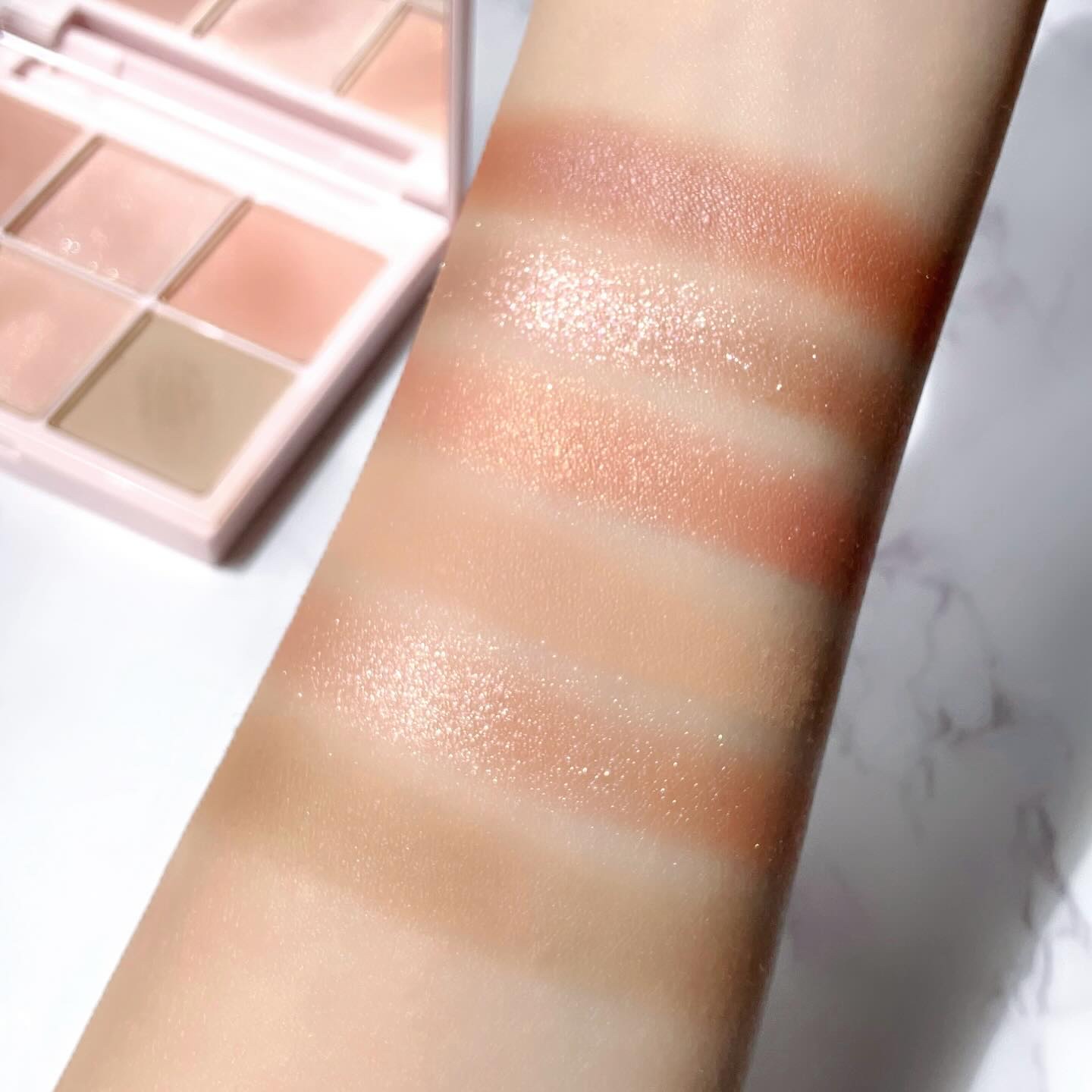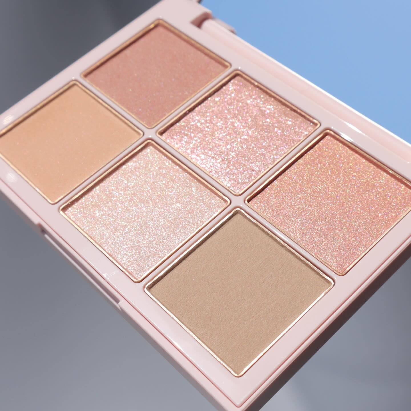 開いた瞬間可愛すぎて思わず声が出たくらいヤバいです。 左上の淡いパールピンクは繊細かつ透明感の塊のピンクパールがぶわぁっと煌めきます。 ゴールド×シルバーでシャンパンゴールドみたいな感じの色合いです🥂