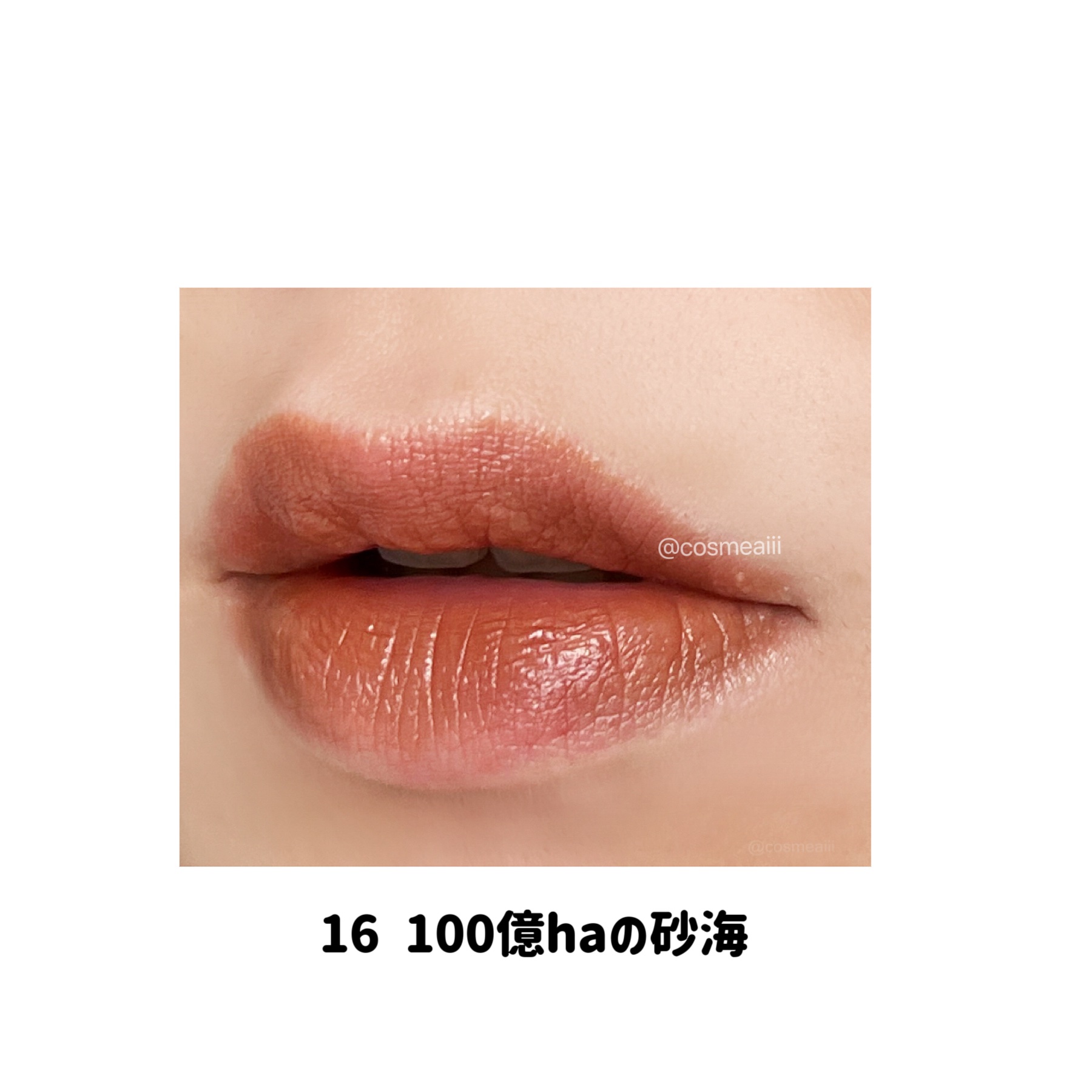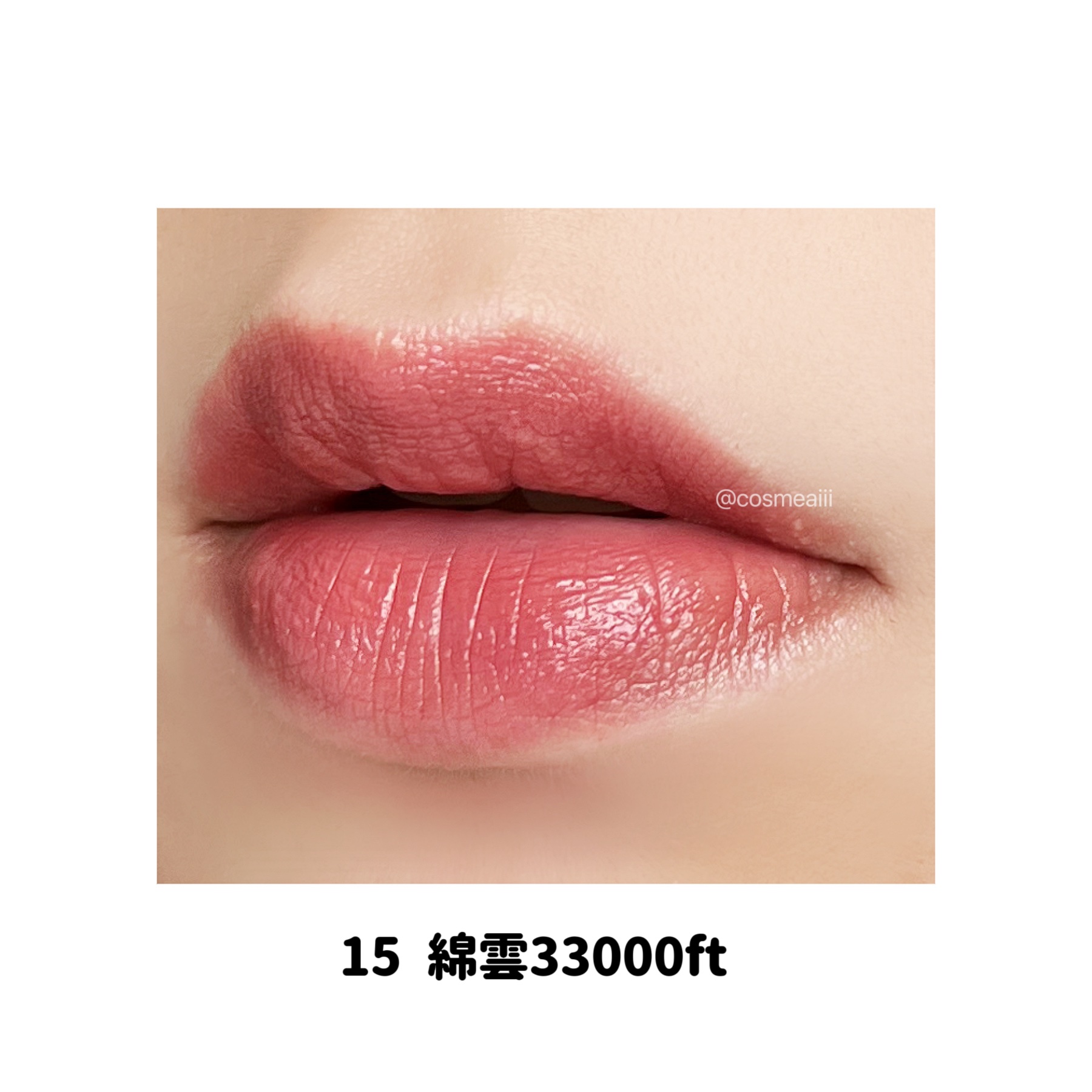 美発色で落ちにくいリップ♪ 唇から蒸発する水分を活用して、密着ジェル膜にすることで つけたての色が持続するんだそう! ▶15 綿雲33000ft 茜色の綿雲みたいなレッドブラウン。シアーな明るめカラーで上品な印象♡ ▶17 神秘のローズ園 バラのようなローズレッド。低めのトーンで華やかさと上品さのバランスが良い♪