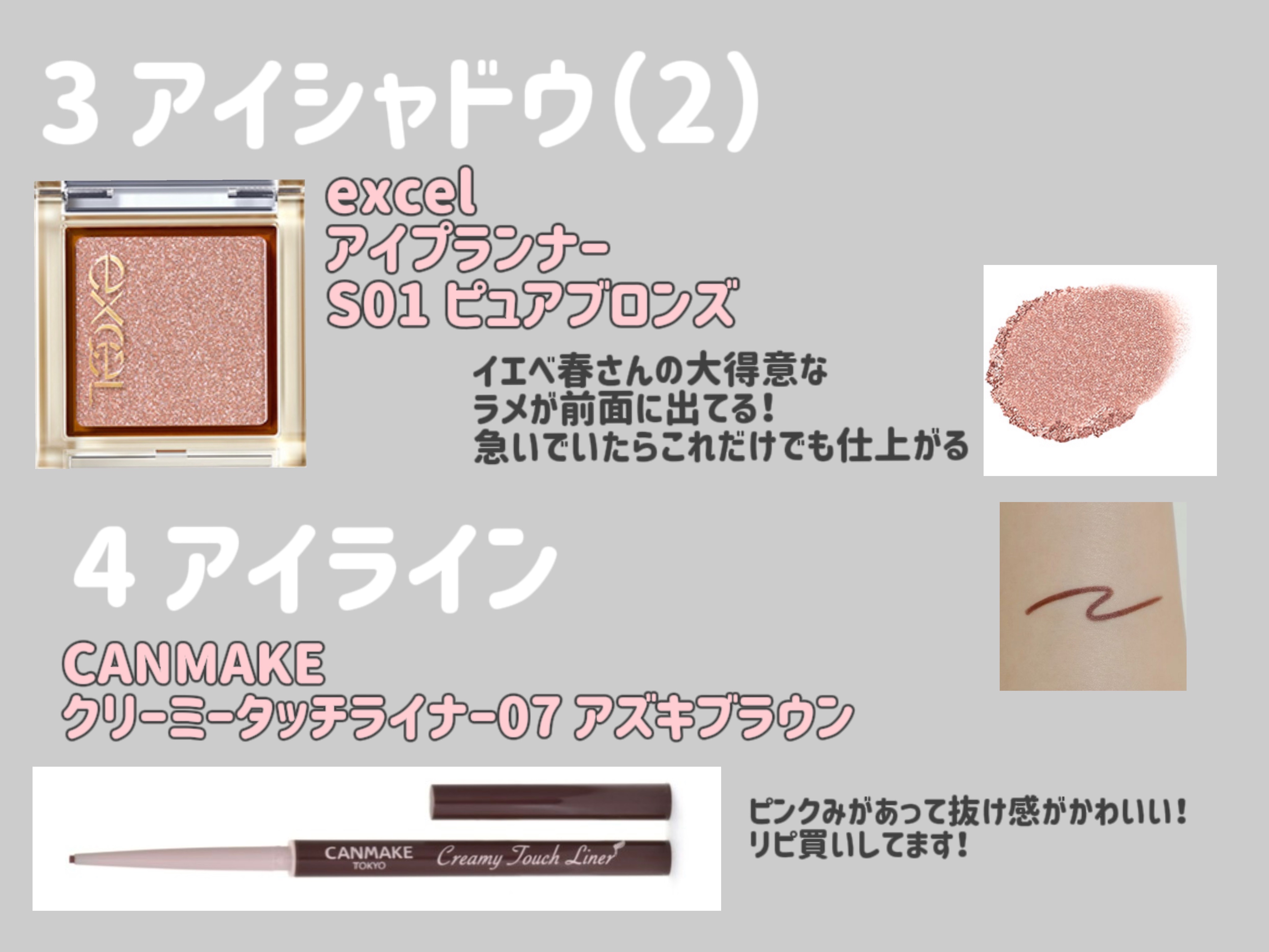 エクセルのアイシャドウは粉質もきめ細かい感じするから仕上がり綺麗になると思う。 CANMAKEのライナーはみんな結構定番に使うくらいスルスル描きやすいよね。 ミルフィーのマスカラはパケがオシャレだし色味もこのピンクブラウンほんと可愛いよ🩷ᩚ