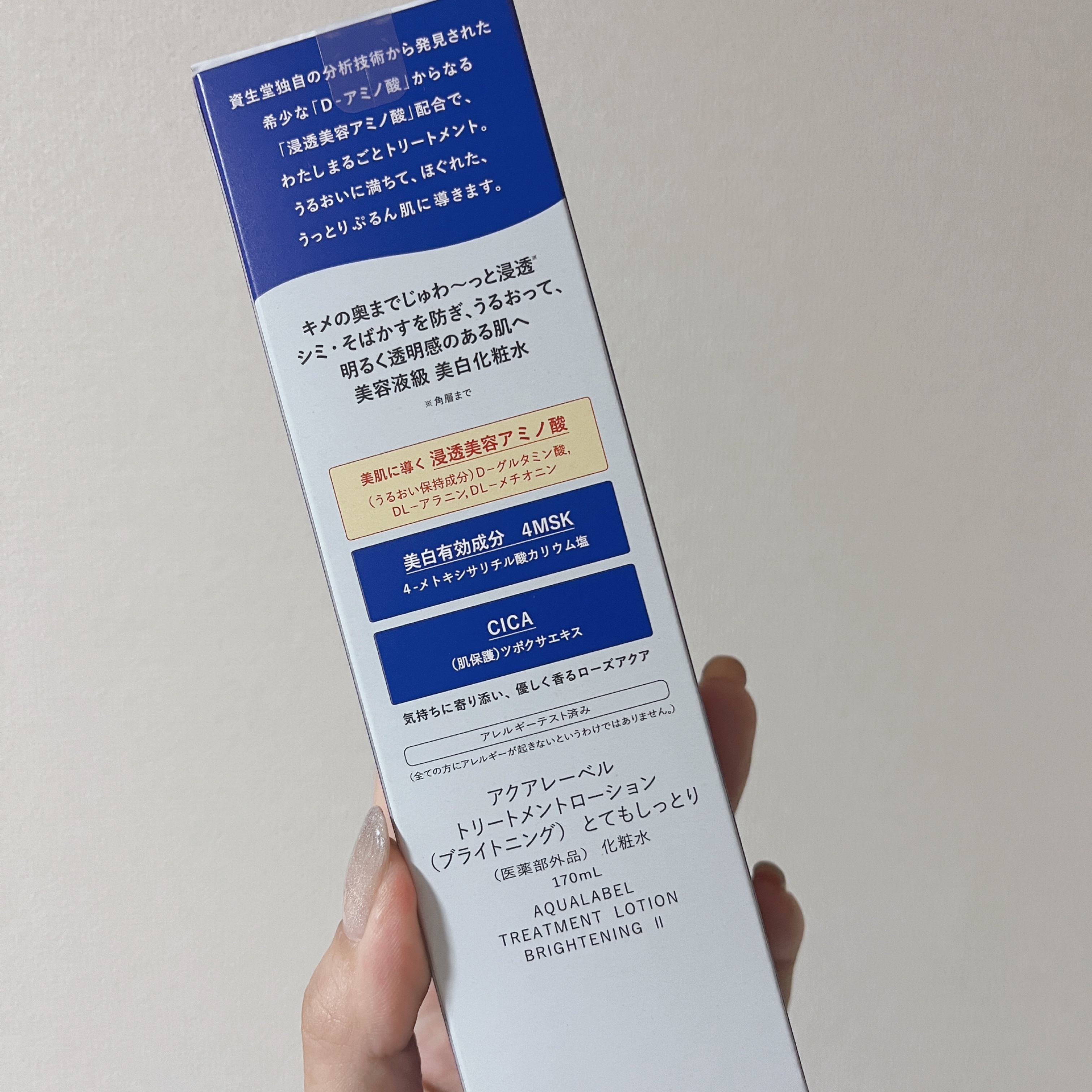 - 【医薬部外品】 <究極の成分コラボ>4MSK*1+CICA*2配合の本気の成分アプローチ 美容液級 美白化粧水 デパコスにも配合の美白*3有効成分4MSK*1がシミのもとに直行。シミ・そばかすを防ぎ、うるおって明るく透明感のある肌へ。 肌を保護するCICA*2、浸透美容アミノ酸*4、Wヒアルロン酸*5、コラーゲンGL*6など、美肌に導く成分を贅沢に配合。 資生堂サロン&スパ エステティシャン監修の、美容液のような心地よい繊細なとろみ液が、キメの奥までじゅわ~っと浸透*7。 優しく香るローズアクアの香りが、快適度を高めます。 「しっとり」と「とてもしっとり」の2タイプがあり、お好みの使用感でお選びいただけます。 *1 メラニンの生成を抑え、シミ・そばかすを防ぐ *2 4-メトキシサリチル酸カリウム塩 *3 (肌保護)ツボクサエキス *4 (うるおい保持成分)D-グルタミン酸、DL-アラニン、DL-メチオニン *5 (保湿成分)アセチル化ヒアルロン酸Na、ヒアルロン酸Na *6 (保湿成分)水溶性コラーゲン、グリセリン *7 角層まで