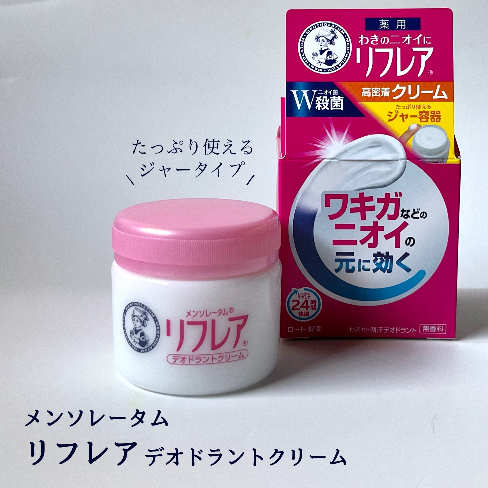 - 気になってしかたない「ワキのニオイ」。「リフレア」シリーズは、Wの殺菌有効成分*でニオイの原因菌をしっかり殺菌。気になるワキのニオイをしっかり抑えることにこだわりました。高密着持続処方。しっかりケアして24時間快適。 「メンソレータム リフレア デオドラントクリーム」は、汗・摩擦に強い高密着持続処方。さらっとした使用感のクリームタイプ。とにかくしっかりケアしたい方におすすめです。 たっぷり使えるジャータイプと、携帯に便利なサイズで手を汚さずに直接ワキに塗れるドーム型チューブをご用意。 *:ベンザルコニウム塩化物、イソプロピルメチルフェノール