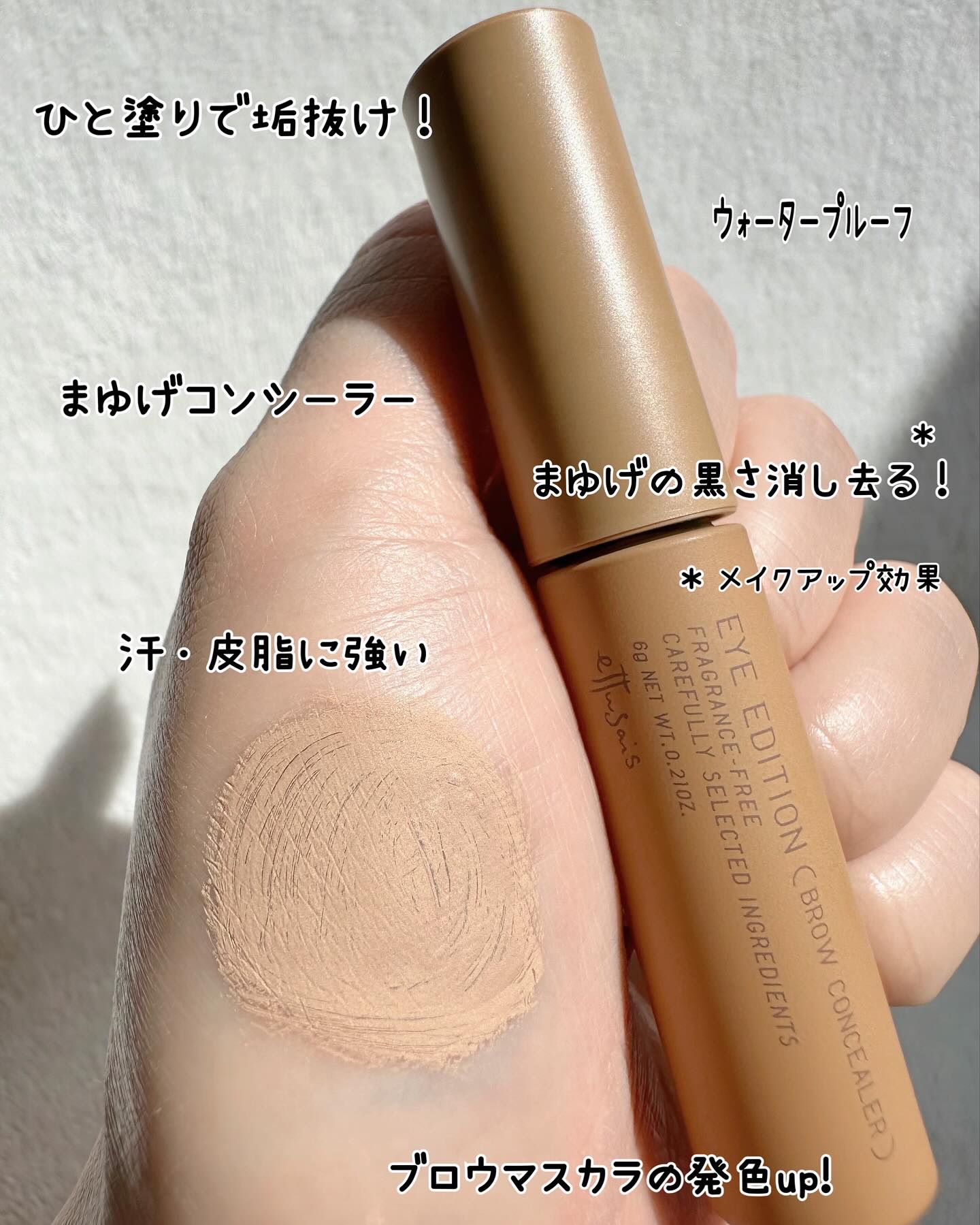 - ひと塗りで垢抜け!自眉の黒さをやわらげる、眉毛コンシーラー。 これ1本で抜け感仕上げ。眉マスカラを重ねれば、思い通りの発色に。 〇濃い眉毛をしっかりカバーし、自眉の印象をやわらげる。さらに眉マスカラを重ねれば、思い通りの発色に。 ーアッシュパール配合 〇眉毛に均一につき、ダマになりにくいストレートソフトブラシ採用。 〇ウォータープルーフ 〇汗、皮脂に強く、美しい仕上がりが長時間持続。 〇美容液成分配合 ー毛髪トリートメント(アミノ酸成分)、毛髪保湿成分(ヒアルロン酸)配合 〇単品でご使用の場合は、洗顔料で落とせる。 〇無香料 〇アレルギーテスト済(すべての方にアレルギーが起きないというわけではありません) 2024年4月18日(木)全国発売<4月4日(木)一部先行発売>