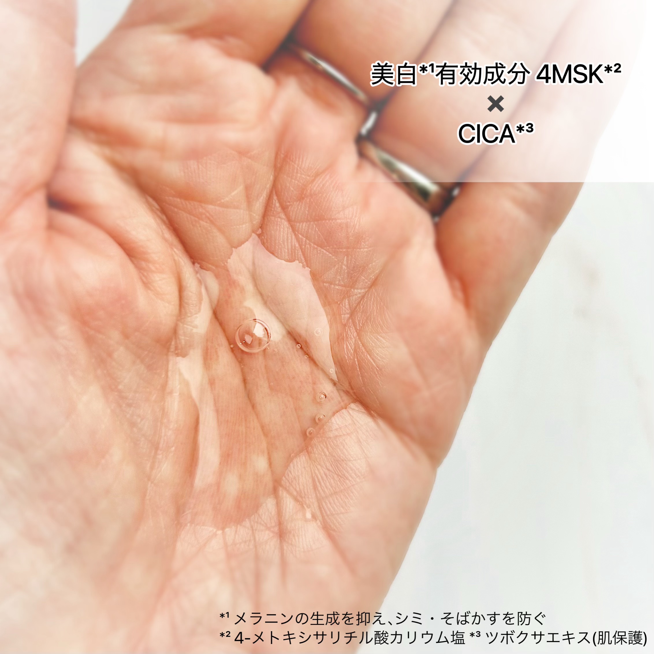 シミを防いで、うるおって明るい肌へ。 美白有効成分4MSK*がシミのもとに直行。 気持ちに寄り添い、優しく香るローズアクアの香り。アレルギーテスト済み(全ての方にアレルギーが起きないというわけではありません。) とろみ感強めでまるで美容液みたいな使用感と保湿力。べたつかずに肌になじみやすいのがお気に入り☻