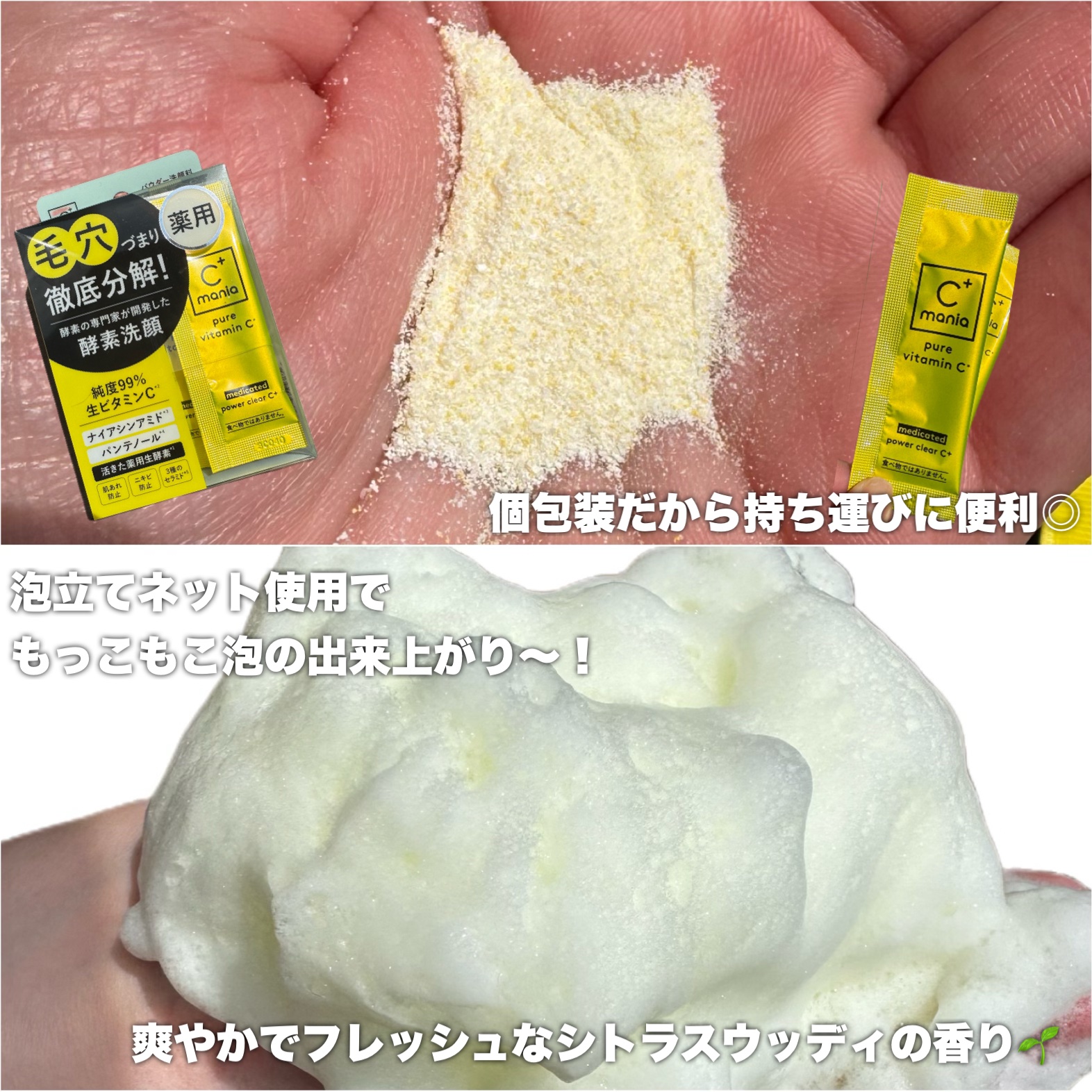 C+mania薬用パワークリアC+医薬部外品酵素の専門家が開発した活きた薬用生酵素(使用時に活性化する)が毛穴汚れを分解。肌を整え、汚れを落とすことにより、光をまとう透明感と、うるおい素肌へ導くビタミン洗顔料なんだって!有効成分蛋白分解酵素グ...