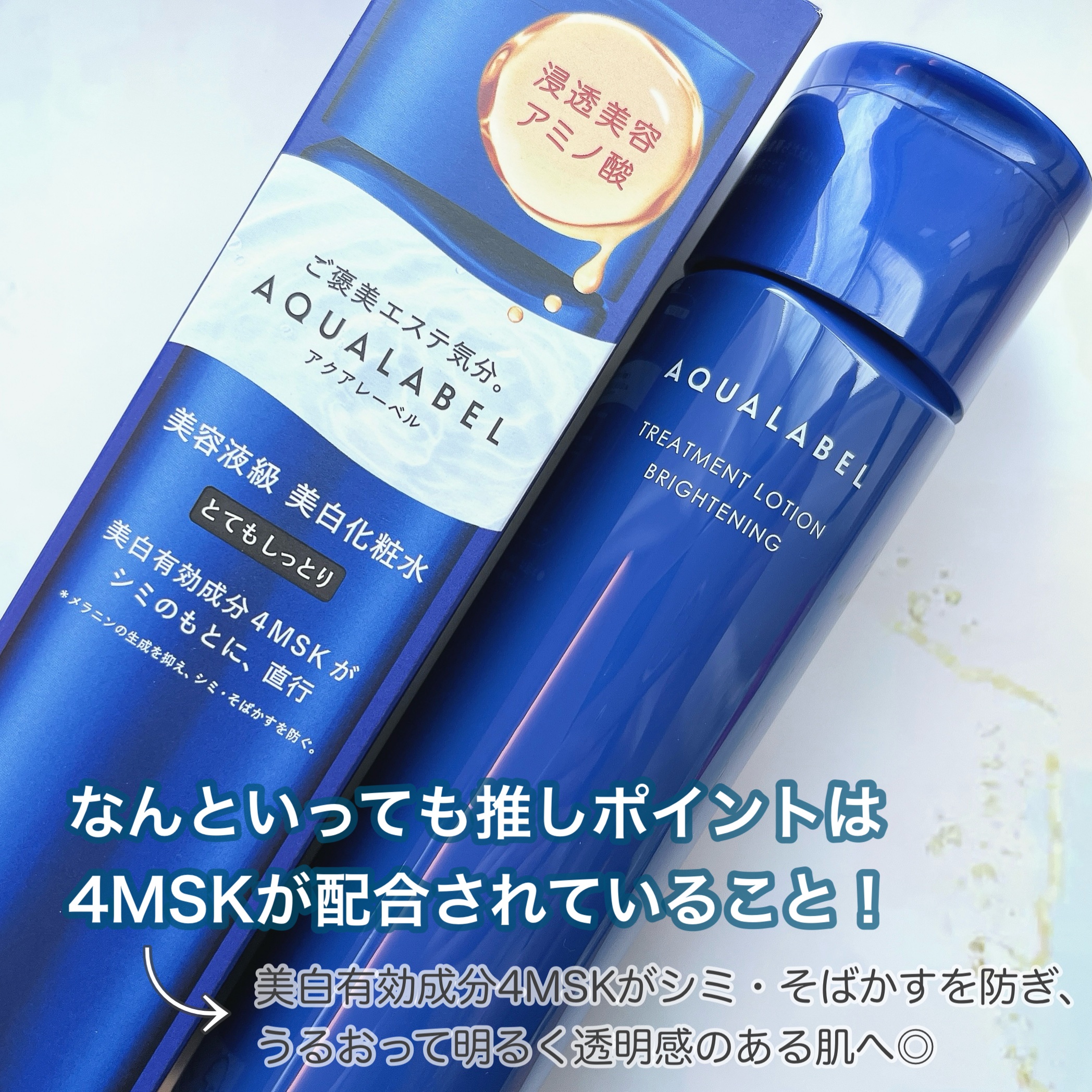 - 【医薬部外品】 <究極の成分コラボ>4MSK*1+CICA*2配合の本気の成分アプローチ 美容液級 美白化粧水 デパコスにも配合の美白*3有効成分4MSK*1がシミのもとに直行。シミ・そばかすを防ぎ、うるおって明るく透明感のある肌へ。 肌を保護するCICA*2、浸透美容アミノ酸*4、Wヒアルロン酸*5、コラーゲンGL*6など、美肌に導く成分を贅沢に配合。 資生堂サロン&スパ エステティシャン監修の、美容液のような心地よい繊細なとろみ液が、キメの奥までじゅわ~っと浸透*7。 優しく香るローズアクアの香りが、快適度を高めます。 「しっとり」と「とてもしっとり」の2タイプがあり、お好みの使用感でお選びいただけます。 *1 メラニンの生成を抑え、シミ・そばかすを防ぐ *2 4-メトキシサリチル酸カリウム塩 *3 (肌保護)ツボクサエキス *4 (うるおい保持成分)D-グルタミン酸、DL-アラニン、DL-メチオニン *5 (保湿成分)アセチル化ヒアルロン酸Na、ヒアルロン酸Na *6 (保湿成分)水溶性コラーゲン、グリセリン *7 角層まで