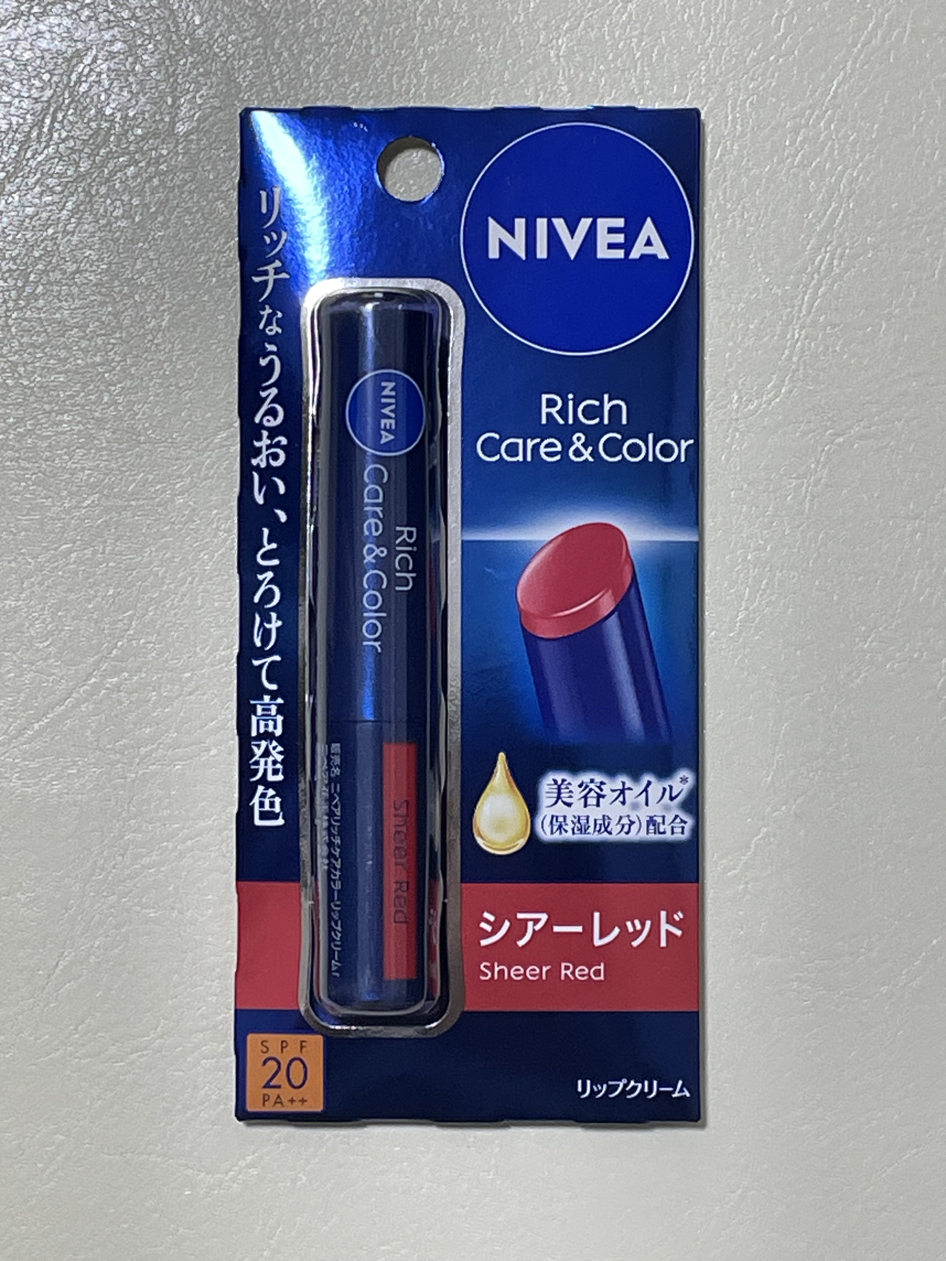 ニベアニベアリッチケア&カラーリップシアーレッド¥847いい感じのむっちり唇でほんのり色付いてこれはいい。#リップクリーム#プチプラ#カラーリップ#色付きリップ#ニベアリップクリーム...