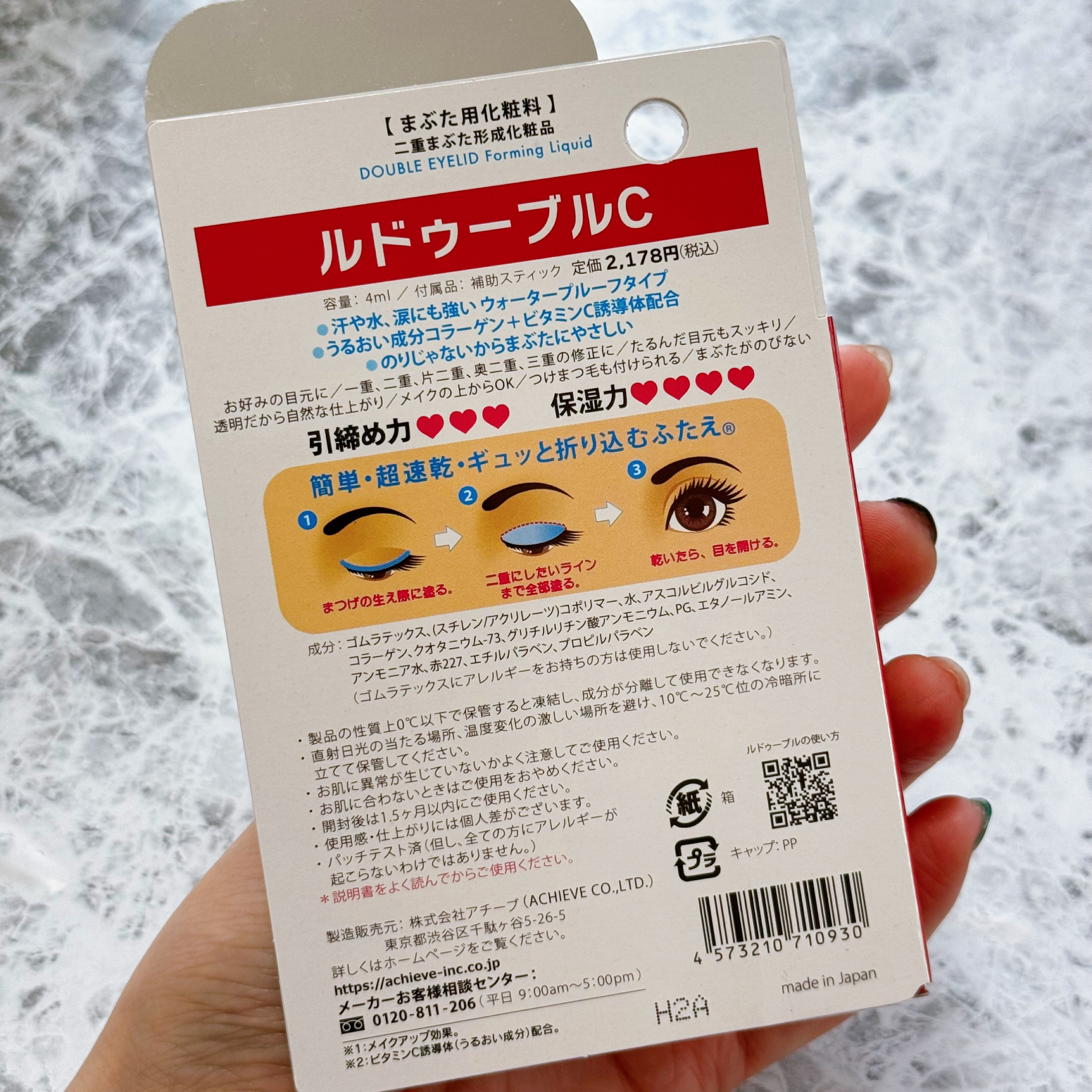 - ★簡単・速乾・ギュッと折り込む二重★ ①生え際に塗る。 ②二重にしたいラインまで全部塗る。 ③乾いたら、目を開ける。 ビタミンC※新配合!より高保湿に♪ たるみが気になるまぶたや、伸びてしまったまぶたもギュッと引締めきれいなふたえに♪ ※ビタミンC誘導体(うるおい成分)配合 製品の性質上0℃以下で保管すると凍結し、成分が分離して使用できなくなります。直射日光の当たる場所、温度変化の激しい場所を避け、10℃~25℃位の冷暗所に立てて保管してください。ゴムラテックスにアレルギーをお持ちの方は使用しないでください。