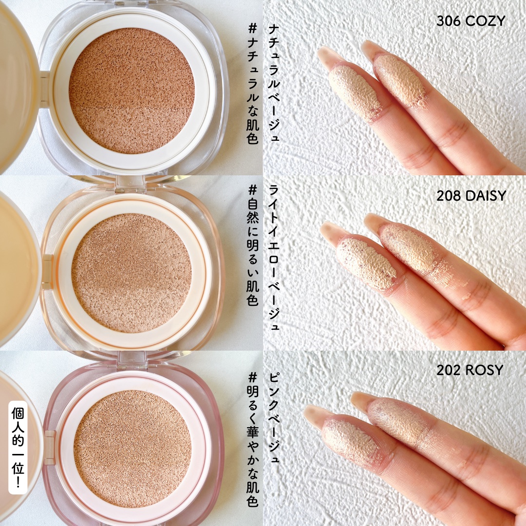 - <202 ロージー> 水,シクロペンタシロキサン,酸化チタン,メトキシケイヒ酸エチルヘキシル,DPG,メチルトリメチコン,酸化亜鉛,ポリメタクリル酸メチル,BG,ラウリルPEG-8ジメチコン,フェニルベンズイミダゾールスルホン酸,ナイアシンアミド,ナイロン-12,トロメタミン,セチルPEG/PPG-10/1ジメチコン,塩化Na,セスキオレイン酸ソルビタン,プロパンジオール,スベリヒユエキス,ジシロキサン,パンテノール,CI 77492,ジステアルジモニウムヘクトライト,安息香酸Na,カプリリルグリコール,(ジメチコン/メチコン)コポリマー,ラウロイルリシン,合成ミツロウ,酢酸トコフェロール,トリエトキシカプリリルシラン,CI 77491,水酸化Al,(トリメチルシロキシケイ酸/ジメチコノール)クロスポリマー,(ジメチコン/ビニルジメチコン)クロスポリマー,ソルビン酸K,ラベンダー油,エチルヘキシルグリセリン,バチルス発酵物,ヒマワリ種子油,アデノシン,CI 77499,エチレンジアミンジコハク酸3Na,ツバキ花エキス,1,2-ヘキサンジオール,ヒアルロン酸Na,加水分解ヒアルロン酸,ヒアルロン酸,シロバナルーピン種子エキス,グリセリン,トリメチルシロキシケイ酸,イチゴ葉エキス,クサスギカズラ根エキス,アウレオバシジウムプルランス培養物,レピジウムメイエニ根エキス,トコフェロール,加水分解コラーゲン,ヒアルロン酸ヒドロキシプロピルトリモニウム,水溶性コラーゲン,アセチルヒアルロン酸Na,加水分解ヒアルロン酸Na,ヒアルロン酸クロスポリマーNa,ヒアルロン酸K,アテロコラーゲン <208 デイジー> 水,シクロペンタシロキサン,酸化チタン,メトキシケイヒ酸エチルヘキシル,DPG,メチルトリメチコン,酸化亜鉛,ポリメタクリル酸メチル,BG,ラウリルPEG-8ジメチコン,フェニルベンズイミダゾールスルホン酸,ナイアシンアミド,ナイロン-12,トロメタミン,セチルPEG/PPG-10/1ジメチコン,塩化Na,セスキオレイン酸ソルビタン,プロパンジオール,スベリヒユエキス,CI 77492,ジシロキサン,パンテノール,ジステアルジモニウムヘクトライト,安息香酸Na,カプリリルグリコール,(ジメチコン/メチコン)コポリマー,ラウロイルリシン,合成ミツロウ,酢酸トコフェロール,トリエトキシカプリリルシラン,水酸化Al,CI 77491,(トリメチルシロキシケイ酸/ジメチコノール)クロスポリマー,(ジメチコン/ビニルジメチコン)クロスポリマー,ソルビン酸K,ラベンダー油,エチルヘキシルグリセリン,バチルス発酵物,ヒマワリ種子油,アデノシン,CI 77499,エチレンジアミンジコハク酸3Na,ツバキ花エキス,1,2-ヘキサンジオール,ヒアルロン酸Na,加水分解ヒアルロン酸,ヒアルロン酸,シロバナルーピン種子エキス,グリセリン,トリメチルシロキシケイ酸,イチゴ葉エキス,クサスギカズラ根エキス,アウレオバシジウムプルランス培養物,レピジウムメイエニ根エキス,トコフェロール,加水分解コラーゲン,ヒアルロン酸ヒドロキシプロピルトリモニウム,水溶性コラーゲン,アセチルヒアルロン酸Na,加水分解ヒアルロン酸Na,ヒアルロン酸クロスポリマーNa,ヒアルロン酸K,アテロコラーゲン <306 コージー> 水,シクロペンタシロキサン,酸化チタン,メトキシケイヒ酸エチルヘキシル,DPG,メチルトリメチコン,酸化亜鉛,ポリメタクリル酸メチル,BG,ラウリルPEG-8ジメチコン,フェニルベンズイミダゾールスルホン酸,ナイアシンアミド,ナイロン-12,トロメタミン,セチルPEG/PPG-10/1ジメチコン,塩化Na,セスキオレイン酸ソルビタン,プロパンジオール,CI 77492,スベリヒユエキス,パンテノール,ジシロキサン,ジステアルジモニウムヘクトライト,ラウロイルリシン,安息香酸Na,(ジメチコン/メチコン)コポリマー,合成ミツロウ,酢酸トコフェロール,CI 77491,水酸化Al,(トリメチルシロキシケイ酸/ジメチコノール)クロスポリマー,トリエトキシカプリリルシラン,(ジメチコン/ビニルジメチコン)クロスポリマー,ソルビン酸K,ラベンダー油,バチルス発酵物,ヒマワリ種子油,ポリヒドロキシステアリン酸,CI 77499,EDTA-2Na,アデノシン,パルミチン酸エチルヘキシル,ミリスチン酸イソプロピル,イソステアリン酸,レシチン,ツバキ花エキス,ポリリシノレイン酸ポリグリセリル-3,1,2-ヘキサンジオール,ヒアルロン酸Na,加水分解ヒアルロン酸,ヒアルロン酸,シロバナルーピン種子エキス,グリセリン,トリメチルシロキシケイ酸,イチゴ葉エキス,クサスギカズラ根エキス,アウレオバシジウムプルランス培養物,レピジウムメイエニ根エキス,加水分解コラーゲン,ヒアルロン酸ヒドロキシプロピルトリモニウム,水溶性コラーゲン,トコフェロール,アセチルヒアルロン酸Na,加水分解ヒアルロン酸Na,ヒアルロン酸クロスポリマーNa,ヒアルロン酸K,アテロコラーゲン