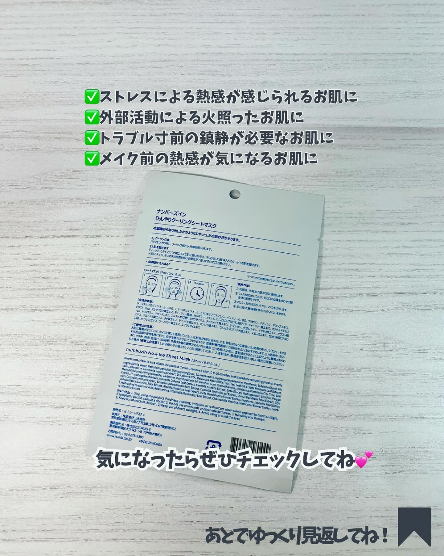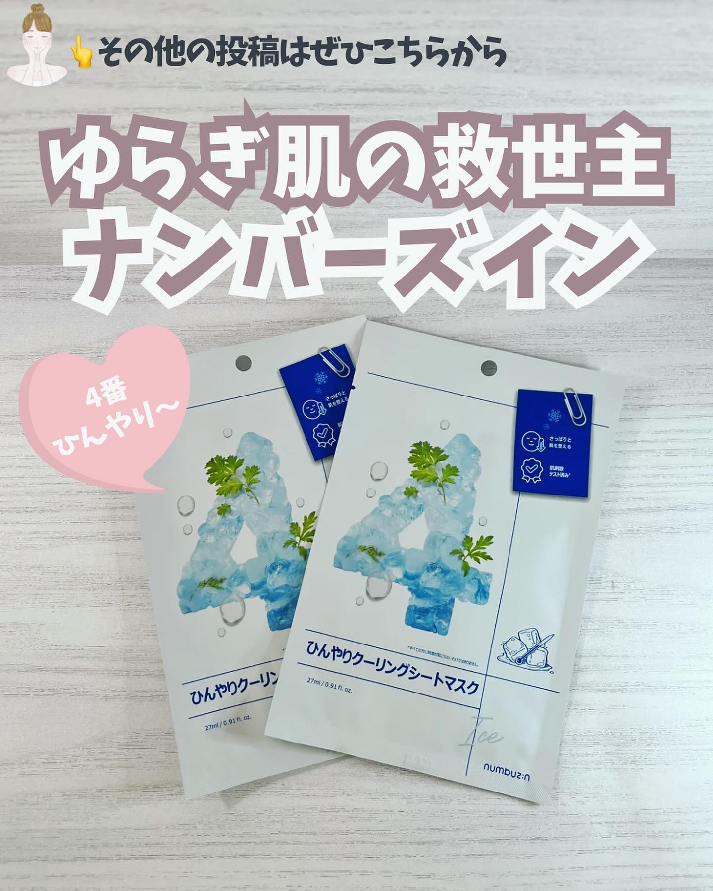 #numbuzin#4番#ひんやりクーリングシートマスク#ナンバーズイン#ナンバーズイン4番冷蔵庫から取り出したかのようなひやっとした#冷感で#ヨモギ入りの#シートがトラブル寸前のお肌をなだめる#鎮静#シートマスクまず開けた時に見たこともない...