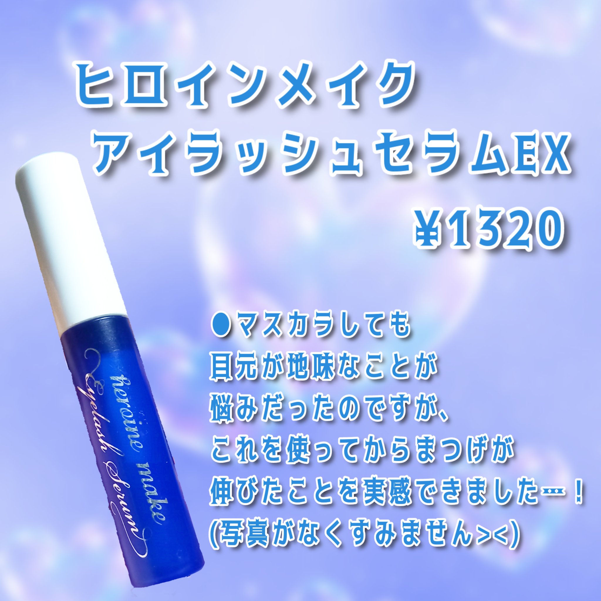 *ヒロインメイク*アイラッシュセラムEX¥1,320リピートしているまつげ美容液ですブラシは小さいお団子が連なった感じ🍡柔らかくてまつ毛の負担になりません液は目に入っても痛くないので手早く塗りやすいですマスカラやアイシャドウがしっかり落ちてい...