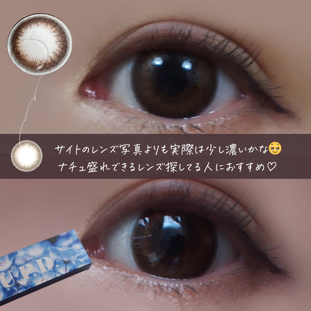 - 「毎日、過去イチかわいいわたし」ナチュラルだけどちゃんと盛れる"正解カラコン"U.P.D. (アプデ)。 もっと可愛く自分をアップデートして欲しいという思いを込めて作られたカラコンです。 ナチュラルな気分の時も盛りたい時も使える大人デザインとサイズ感がちょうど良いデザイン。 カラーコンタクトレンズの不適正使用による眼障害の危険性等などがあります。 ●コンタクトレンズは高度管理医療機器です。不十分な洗浄・消毒など不適切なケアや、長時間・交換期間を超えた装用により、アレルギー性結膜炎、角膜感染症、角膜潰瘍等の重篤な眼障害が発生する危険性があります ●ご使用前に取扱説明書を確認してください 使用上の留意事項 ●眼科医院等を受診してからお求めください ●眼に異常を感じたら直ちにレンズ使用を中止し、お近くの眼科等で診察を受けてください ●医師の指示にしたがってご使用ください ●コンタクトレンズを装用する場合、自覚症状がなくても、眼科医院等での定期検査を受けてください ●レンズに不具合がある場合は使用しないでください